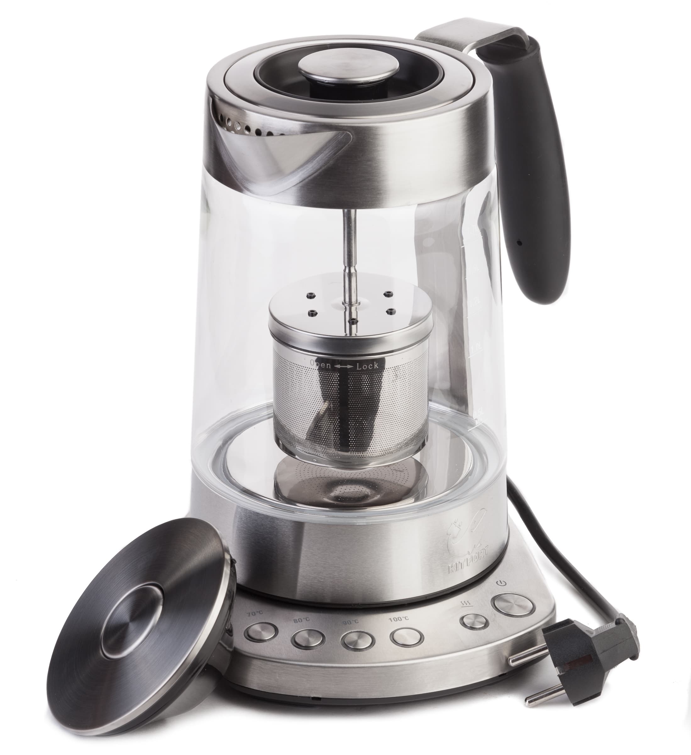 Но все-таки не включить в список рекомендованных «обычным людям» хотя бы один чайник со стеклянной колбой мы не могли — уж очень нам нравится это решение. Тем более что и крышка у него «по-нашему правильная» — полностью съемная. Да еще и возможность заварки чая предусмотрена. Кстати, цена по сравнению с предыдущим вариантом вам тоже понравится. Встречайте: Kitfort KT-601.
