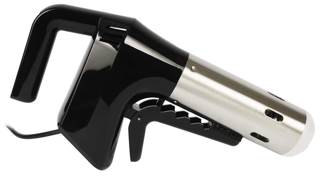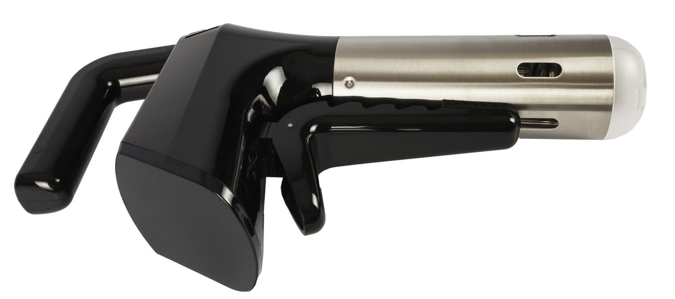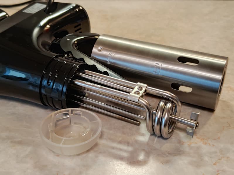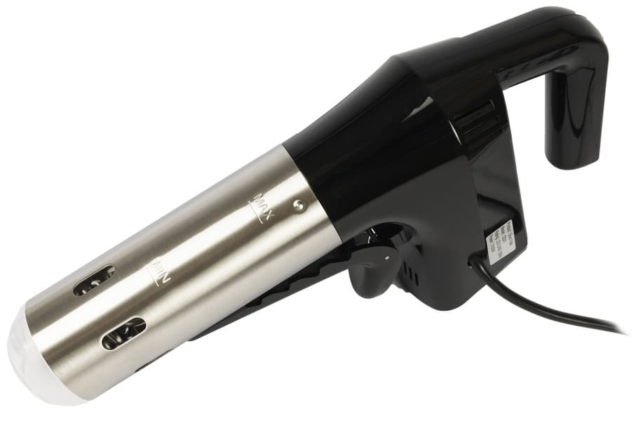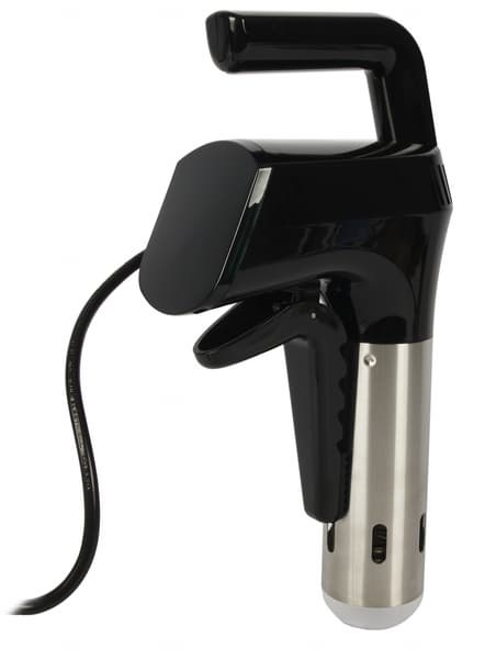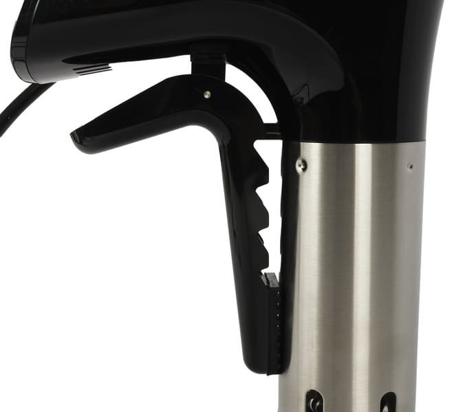 Sous vide Kitch Delvita имеет типичную для погружных су-видов форму: наружная ручка, погружная часть с нагревательным элементом и винтом, мощная прищепка, чтобы удерживать конструкцию внутри емкости с водой. Верхняя часть корпуса изготовлена из черного пластика с глянцевой поверхностью. Нижняя погружная часть — из металла.