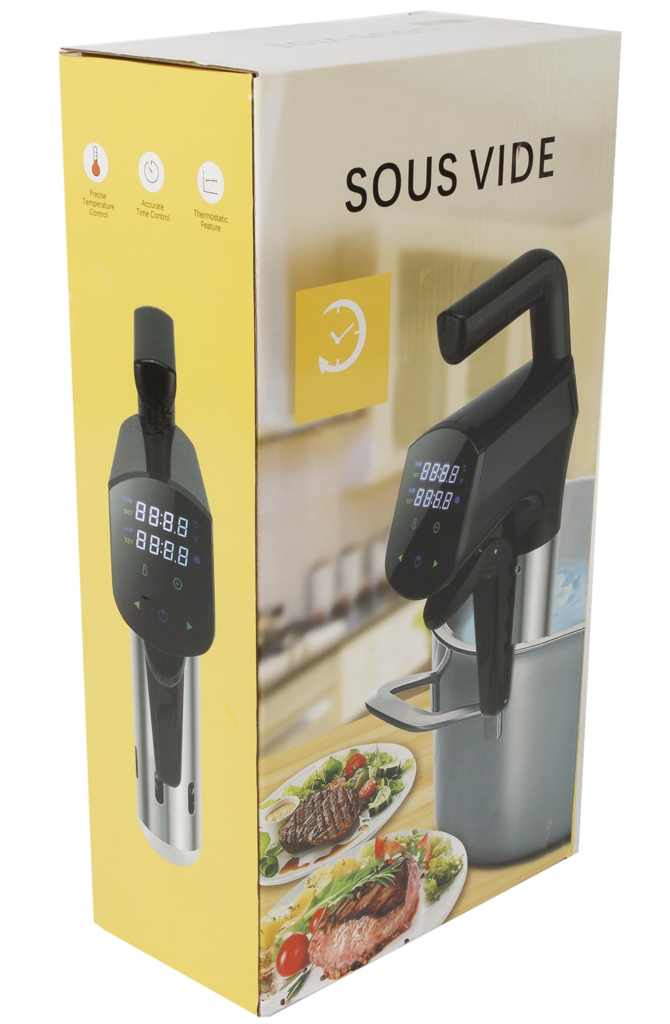 Sous vide упакован в относительно небольшую коробку, изготовленную из плотного глянцевого картона. На фронтальных сторонах крупным планом размещена фотография устройства, на боковых — снимки прибора в других ракурсах и краткое описание его функций. Ручкой для переноски упаковка не снабжена.