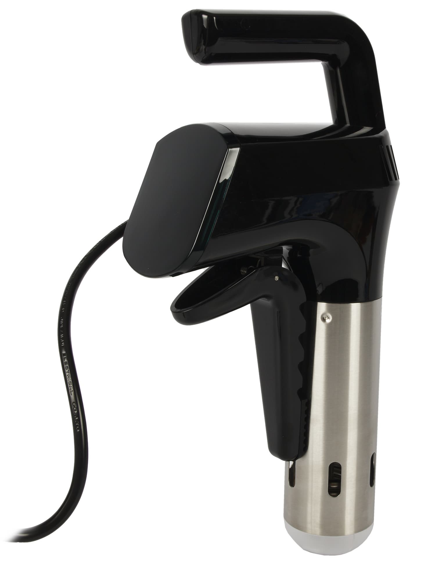 Шнур прикреплен слева от панели управления, длина его представляется нам достаточной для эксплуатации сувида в типовых домашних условиях. Чуть выше можно видеть наклейку с информацией об изделии. Погружная часть выполнена из металла. На ее поверхности с внешней стороны имеются отметки о максимальном и минимальном уровне воды.