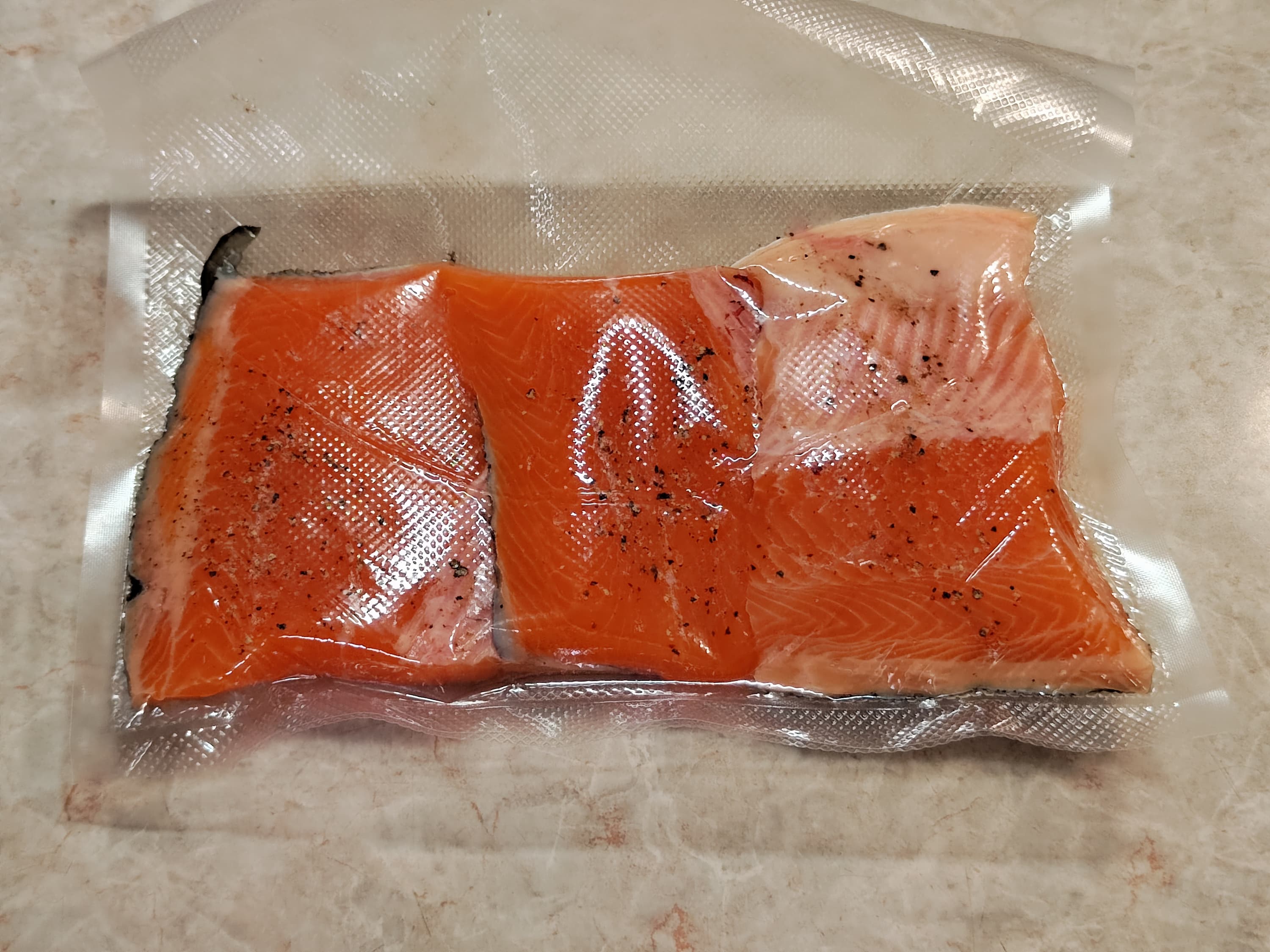 Книга рецептов рекомендует варить лососевые породы на температуре от 52 °C. На столь высокую кухню мы не решились и потому готовили при 65 °C в течение 20 минут.