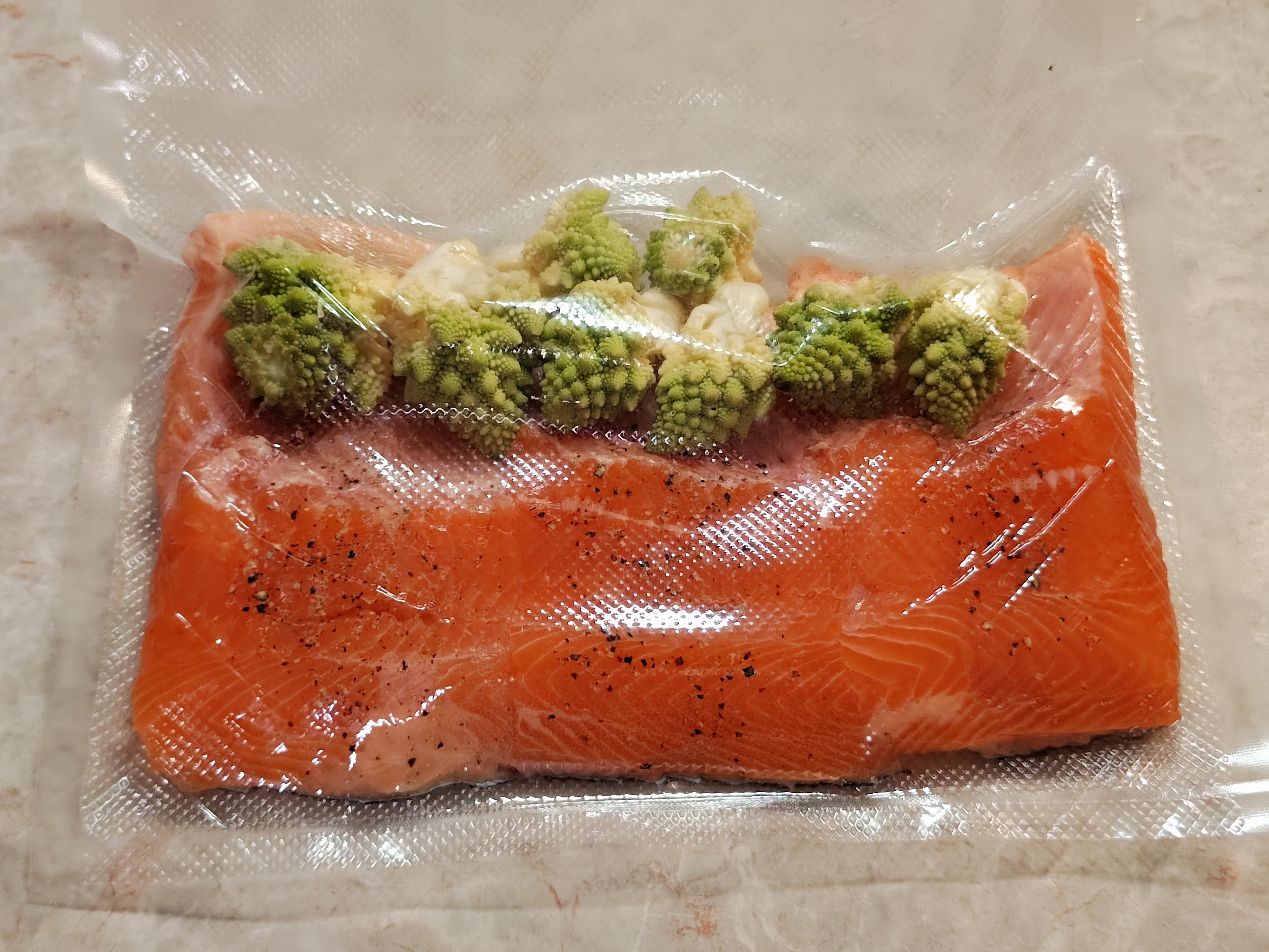 Разделали форель, срезали филе, затем разделили каждую половину на три кусочка. Посыпали солью-специями и завакуумировали. В один пакет положили несколько соцветий живописной капусты.