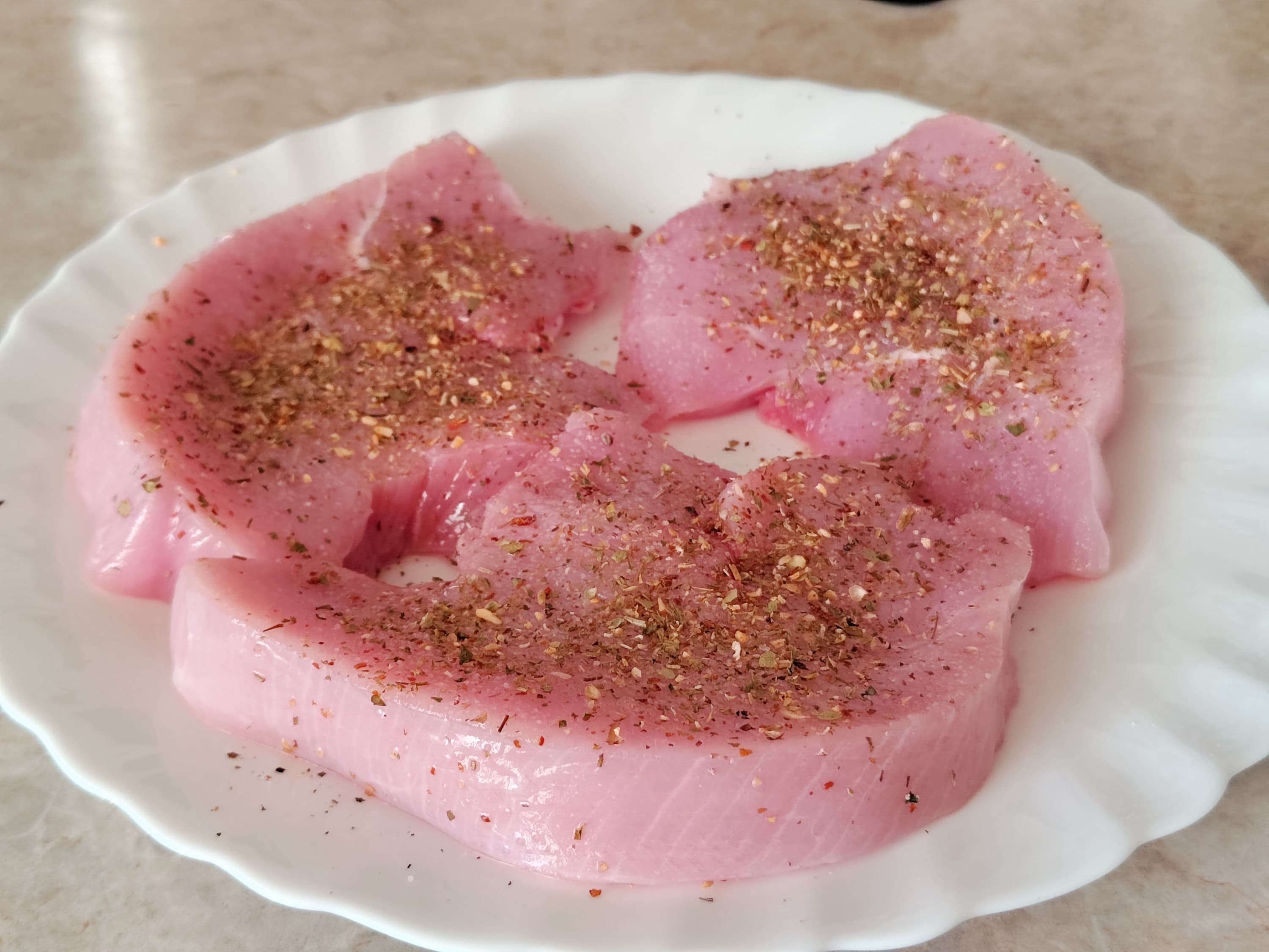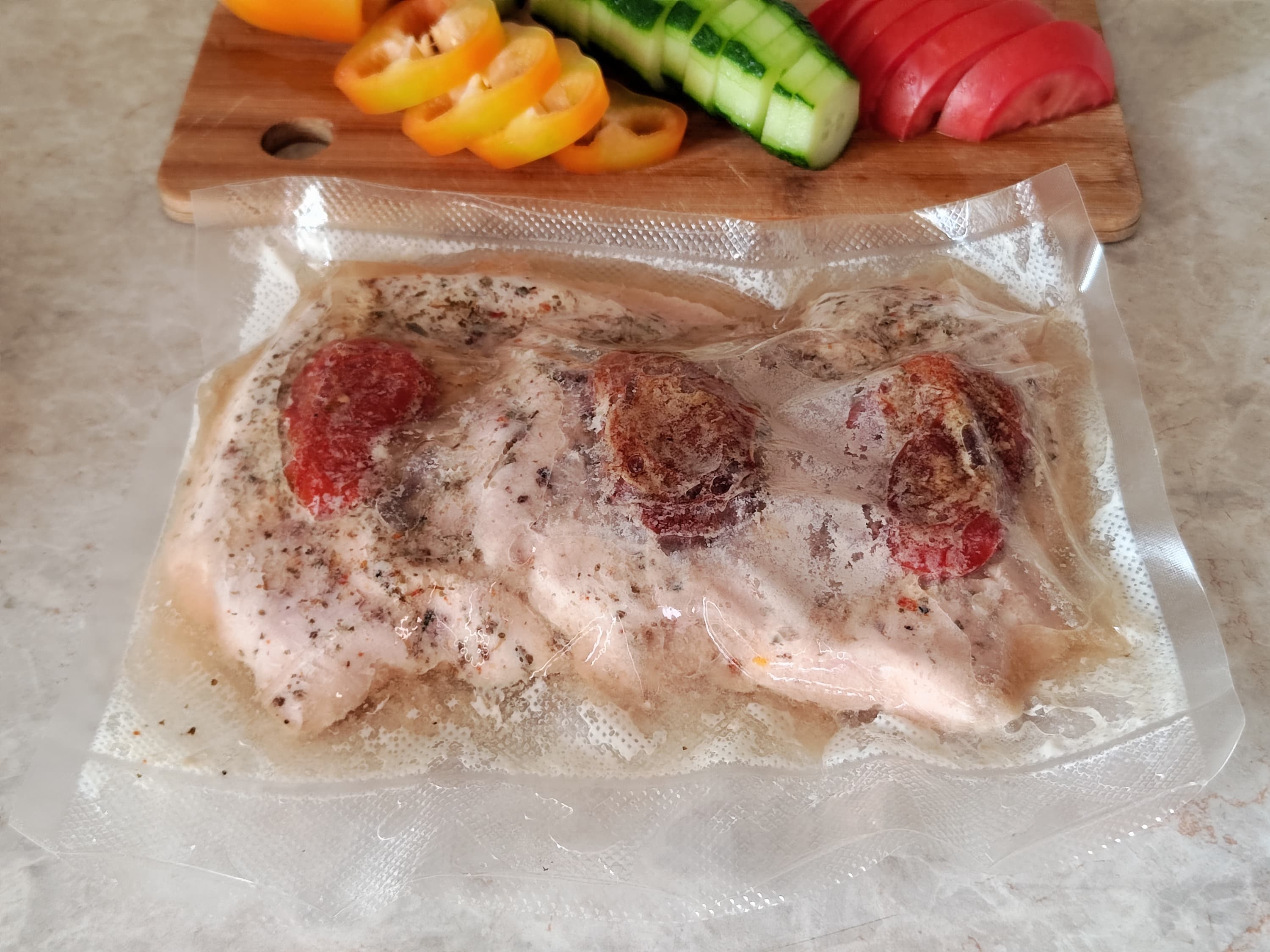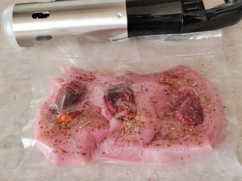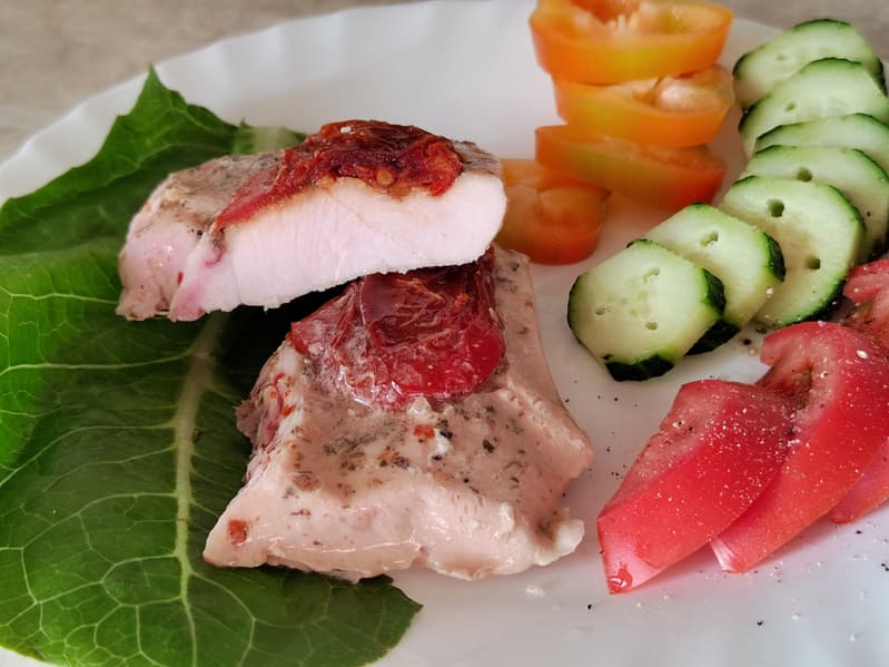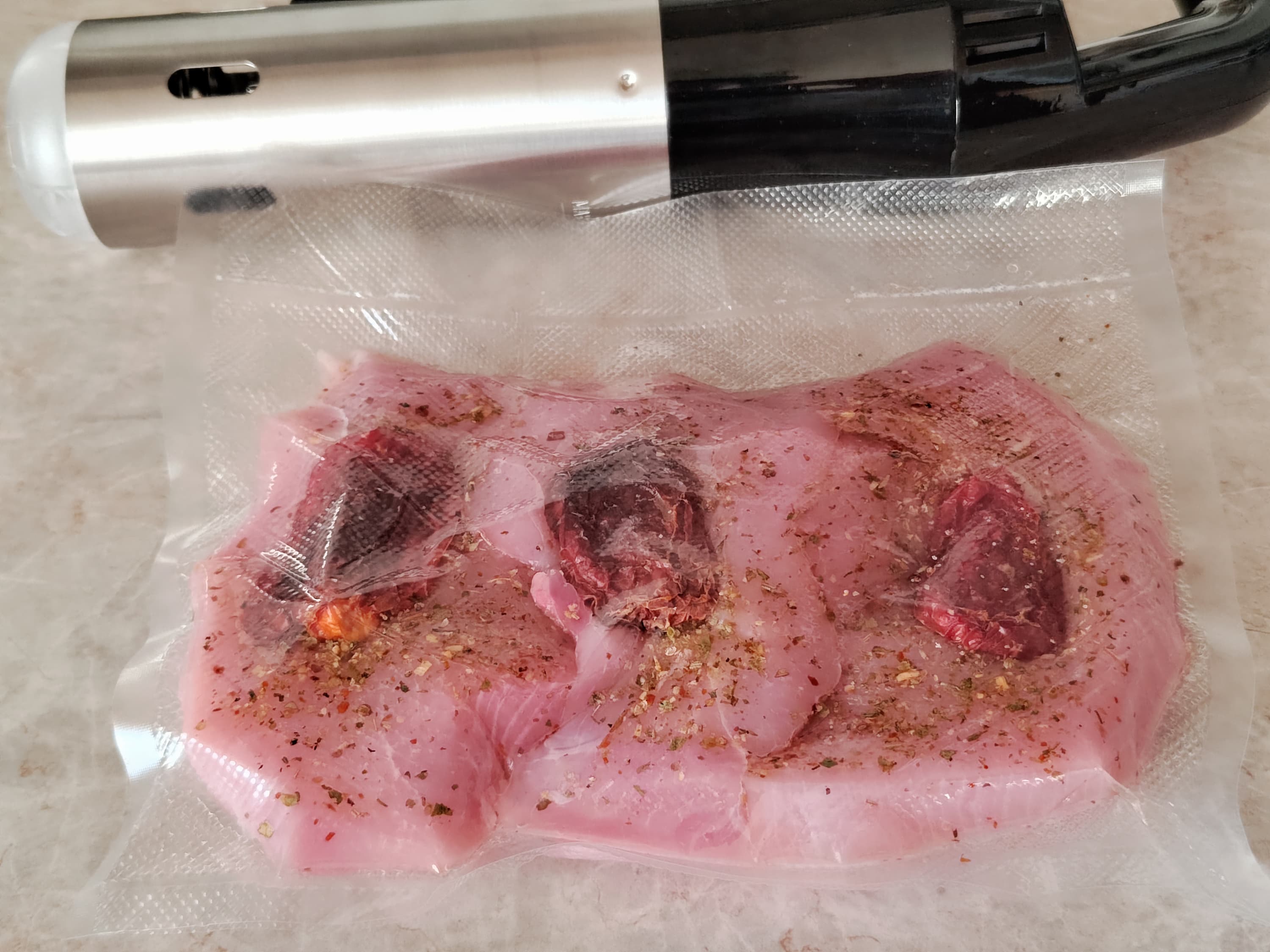 Индюшачью грудку, разделанную на три стейка, посыпали крупной солью, смесью специй и завакуумировали, положив на каждый кусочек по ломтику сухого томата — он добавит приятного вкуса и избавит от лишней влаги, вобрав ее в себя.