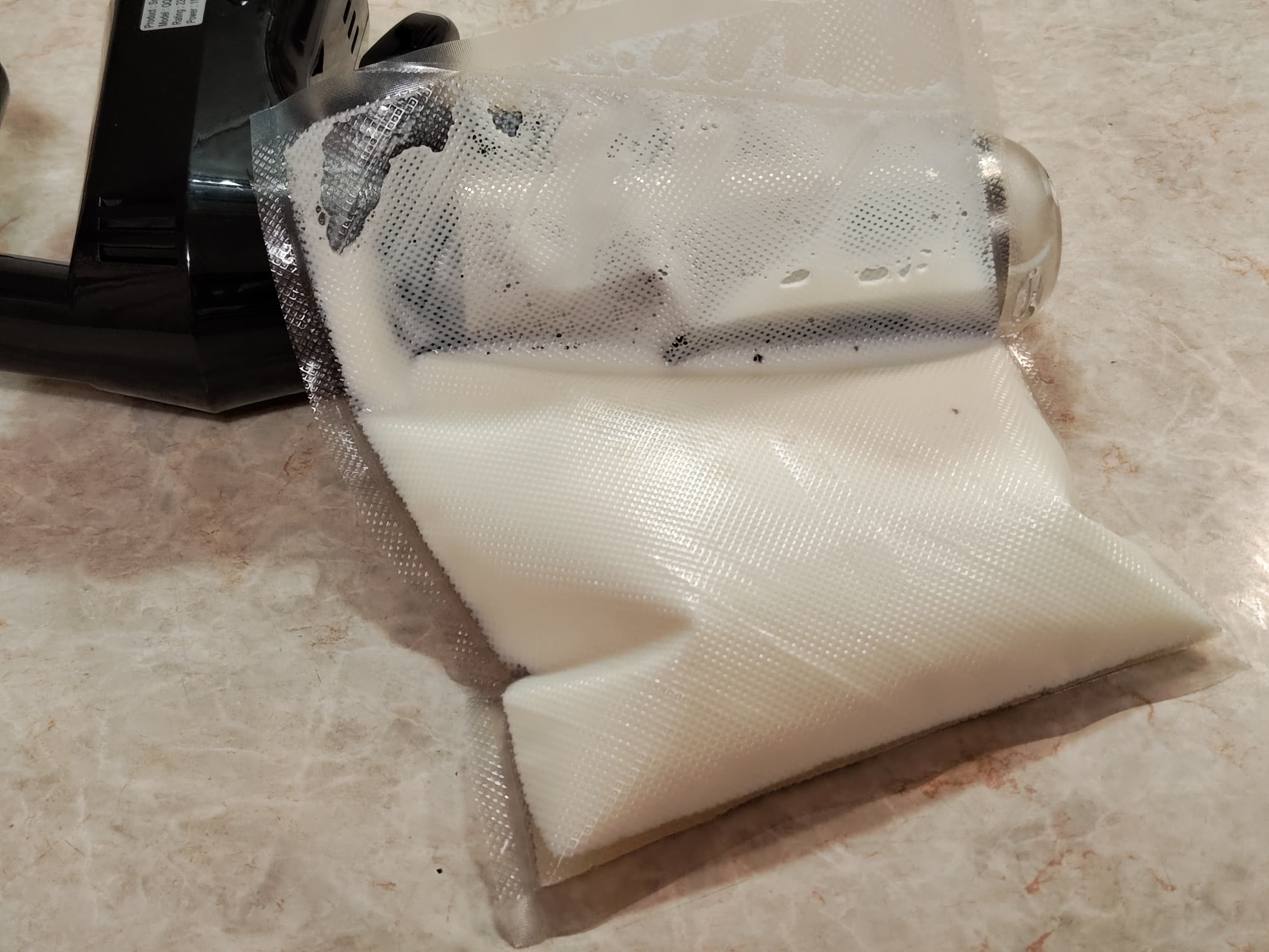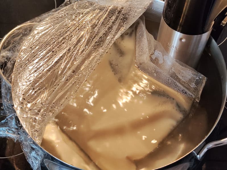 Залили молоко в вакуумный пакет, всыпали туда же остальные ингредиенты. Аккуратно завакуумировали, хорошо встряхнули содержимое и уложили в кастрюлю на 13 часов при 85 °C.