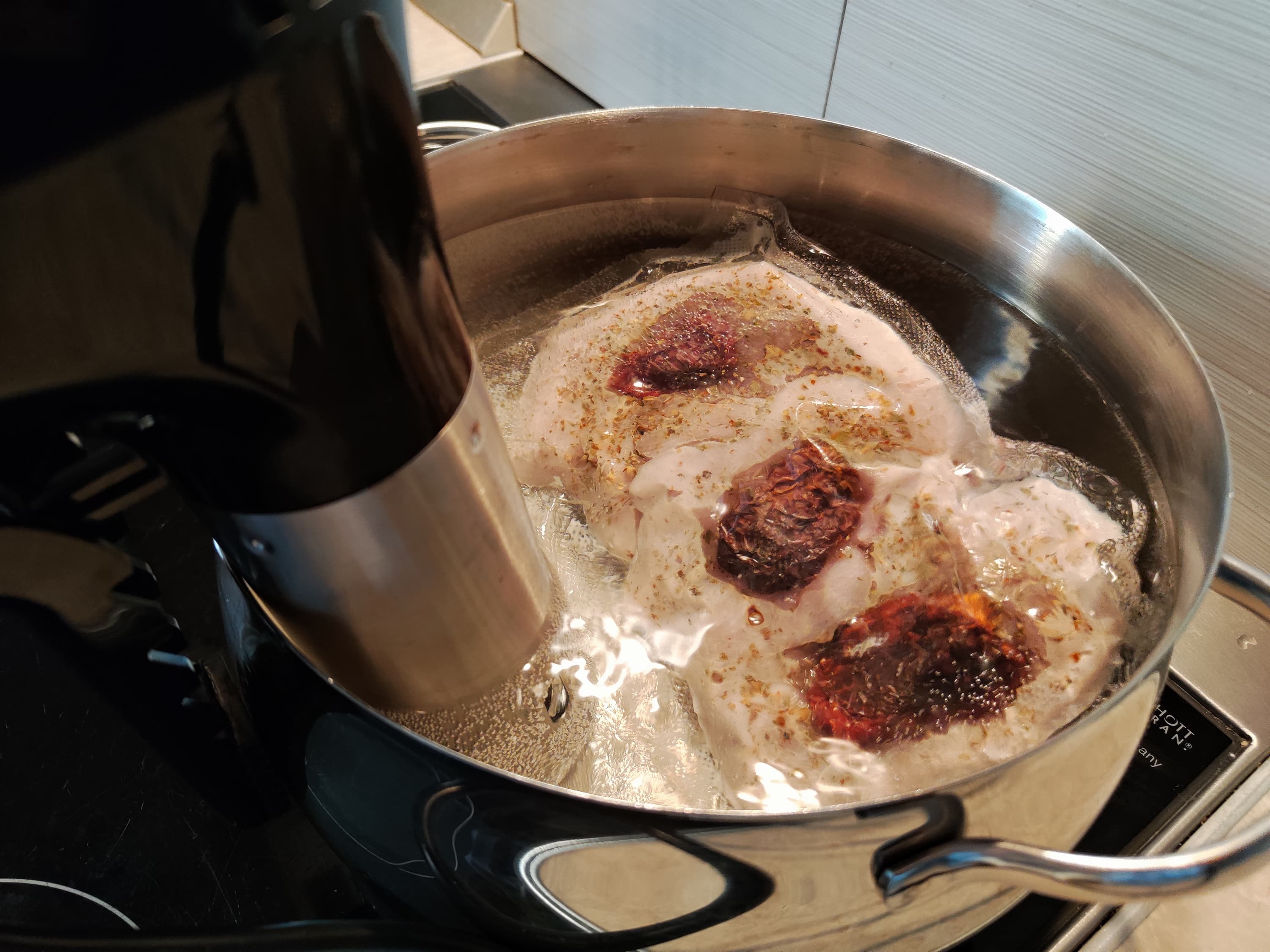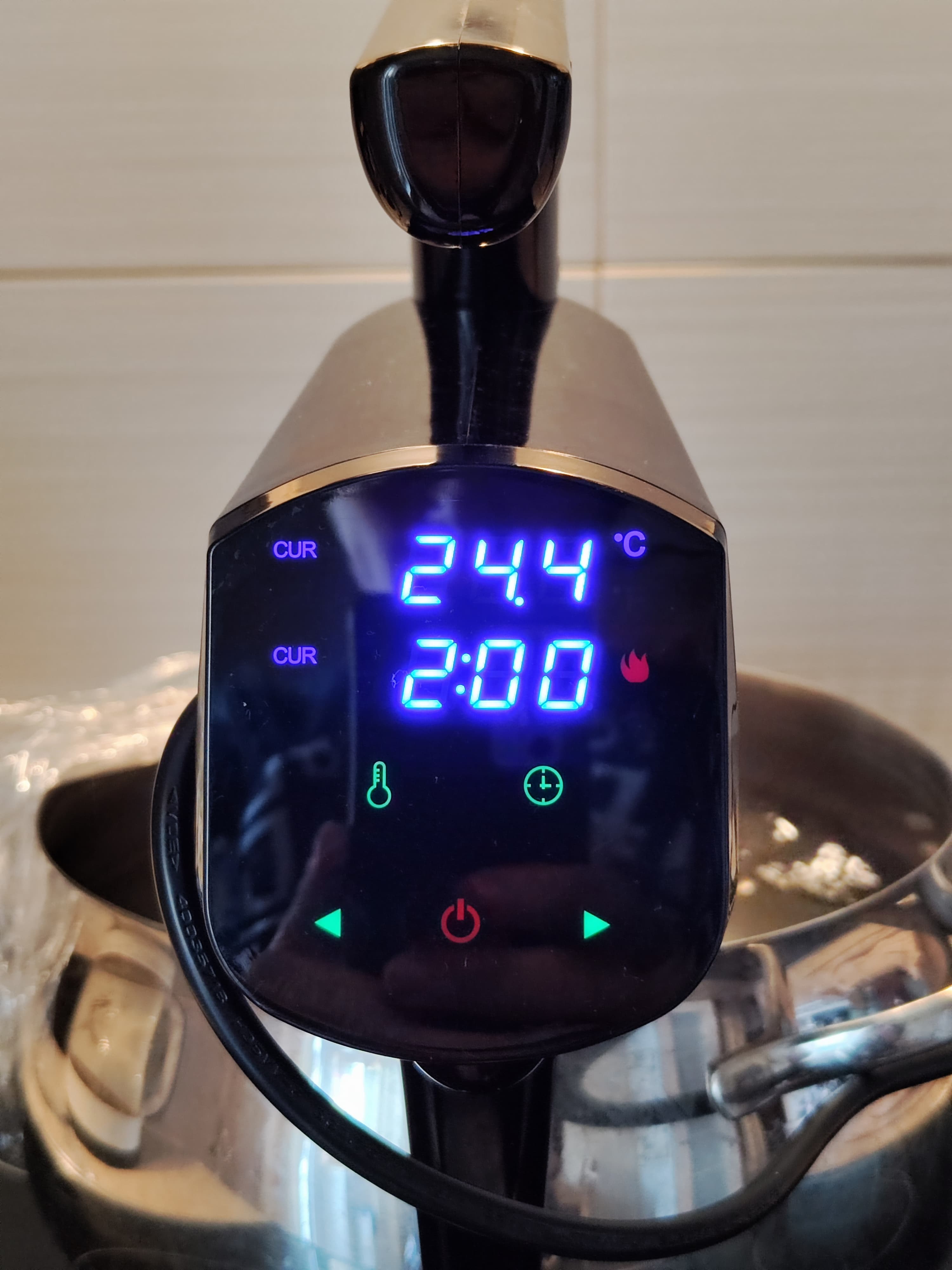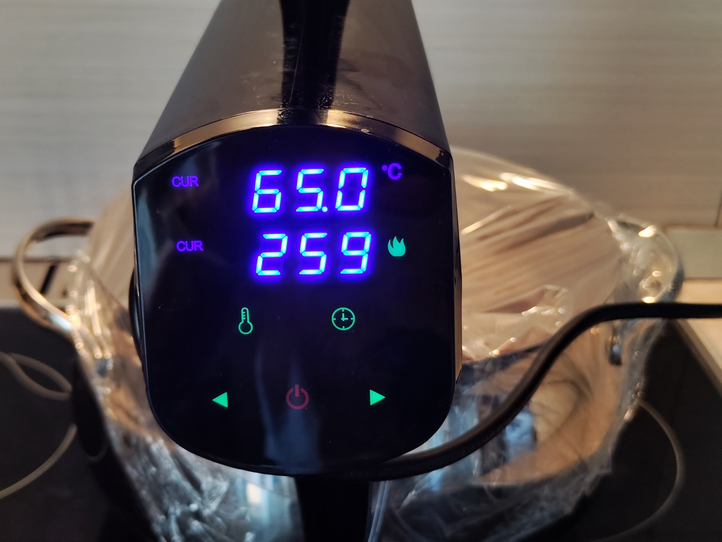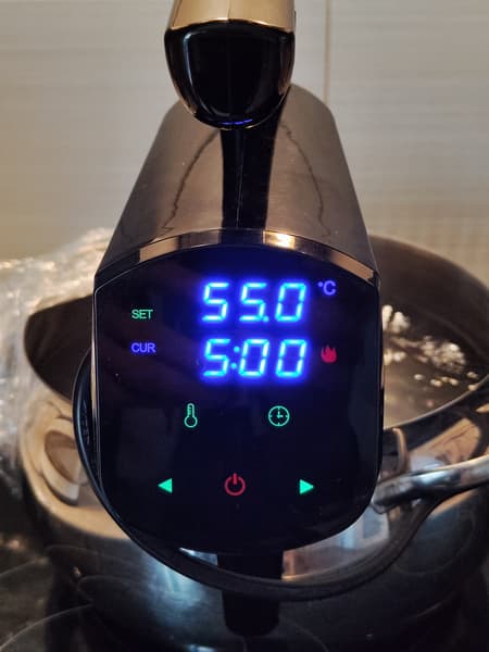 Ориентируясь на рекомендации книги рецептов, варили 3 часа на 65 °C. С начальных 18,3 °C прибор нагрел воду до нужных 65 °C за 15 минут 40 секунд. Варили в большой пятилитровой кастрюле, наполнив ее на ⅔, чтобы вода достигла уровня повыше отметки Min на погружной части сувида.
