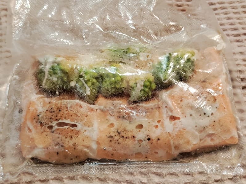 Довольно быстро для низкотемпературной варки, но и кусочки были не очень толстые. Рыба приготовилась, была чрезвычайно мягка и нежна. Капуста ожидаемо диссонировала своей жесткостью — овощи требуют температуру повыше (согласно рекомендациям книги рецептов, от 84 до 87 °C).