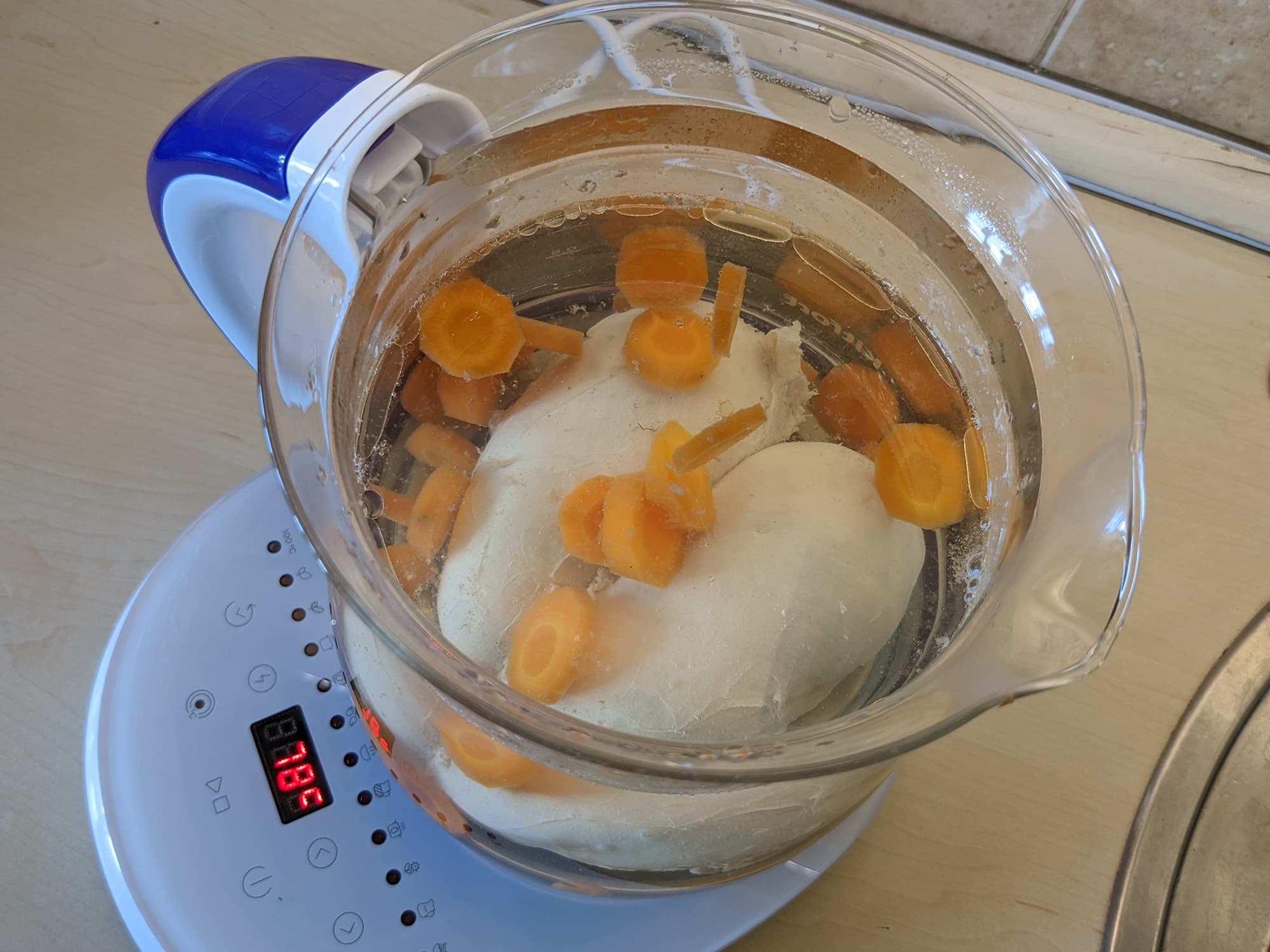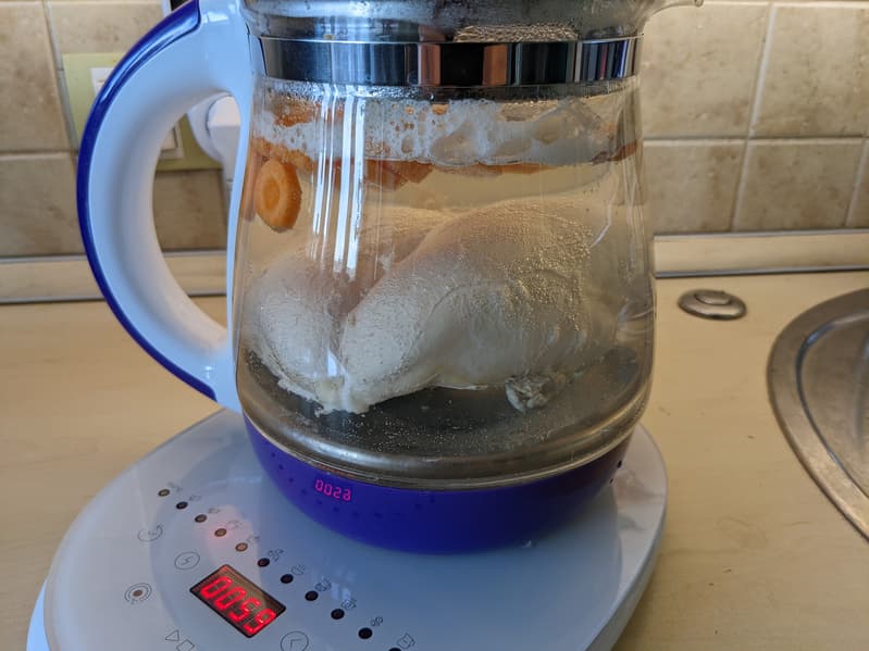 Для тестирования режима «Бульон», предназначенного для варки легких супов из птицы, мы взяли филе одной куриной грудки и небольшую морковь. Мясо мы положили в колбу, не нарезая, а морковку почистили и нарезали кружками.