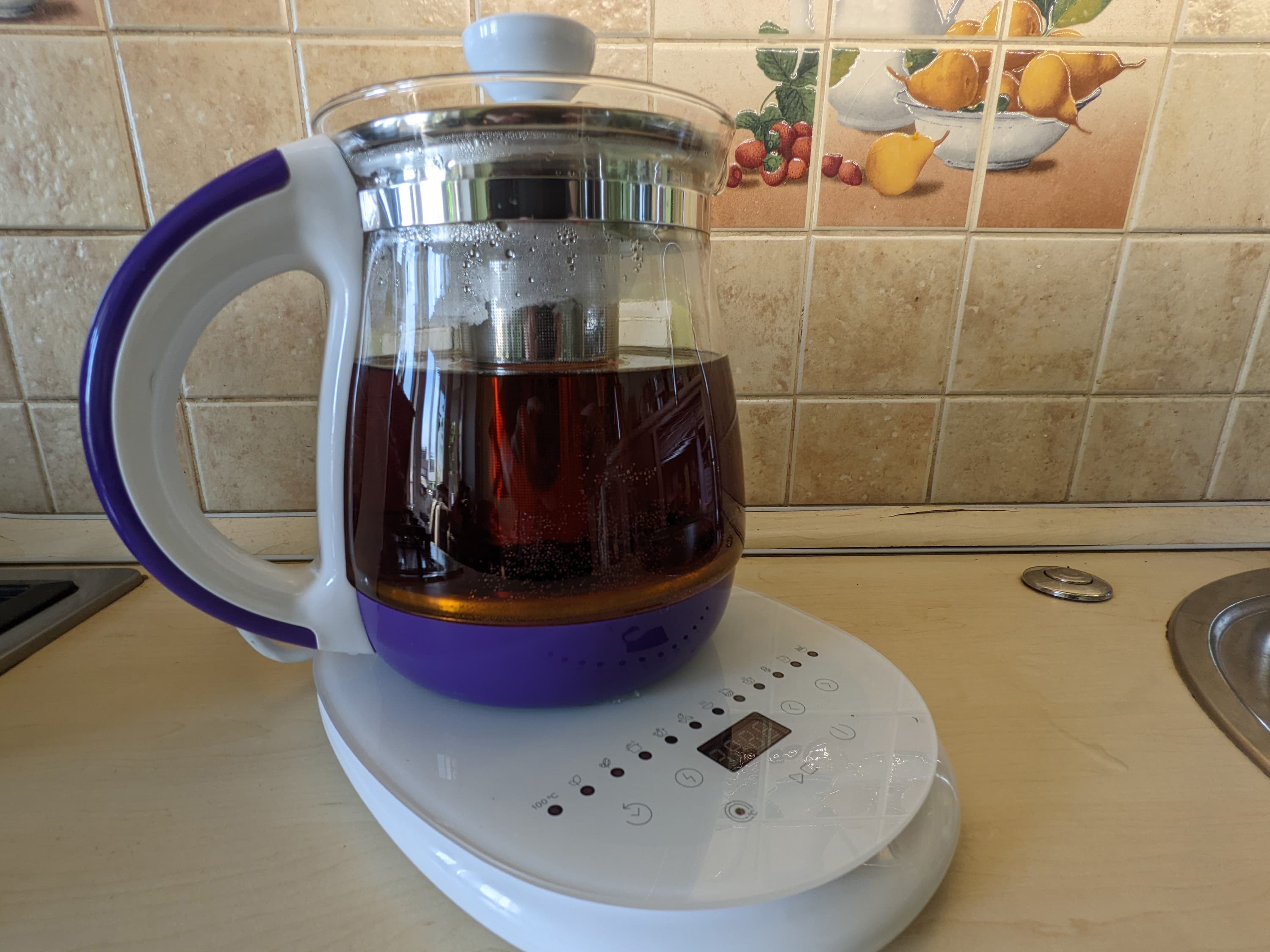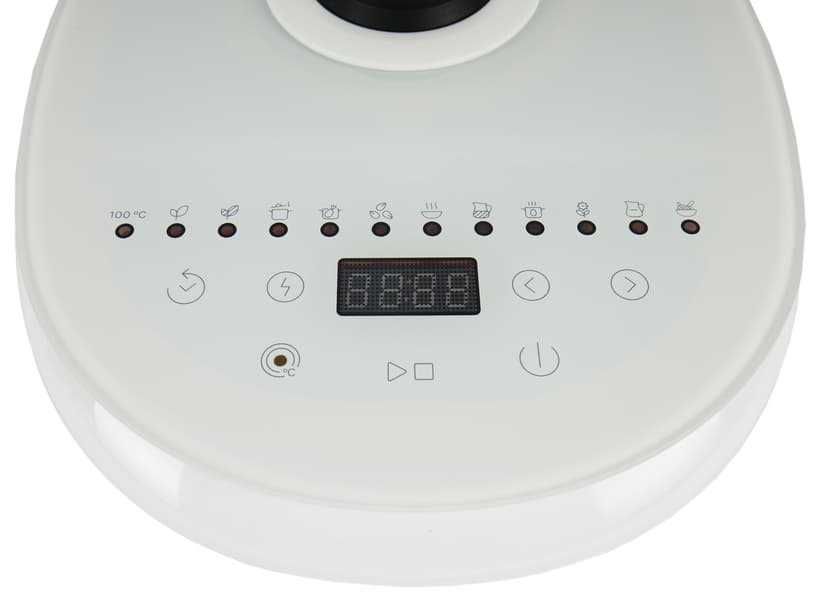 Верхняя панель базы сделана из закаленного стекла с белой подложкой. Помимо традиционной контактной группы, на ней мы видим цифровой дисплей, сенсорные кнопки управления и длинный ряд индикаторов режимов: их у нашего чайника целых одиннадцать.
