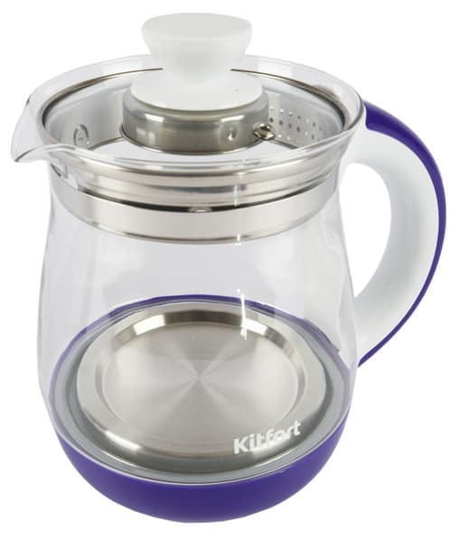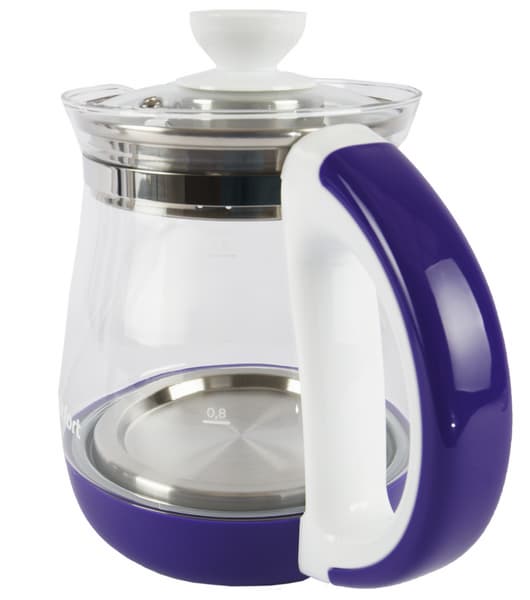 На емкости у дна нанесен логотип производителя, а ближе к ручке — отметки уровня воды: 0,8, 1,3 и 1,8 литра. Ручка и основание сделаны из фиолетового пластика с белыми элементами. Для тех, кому такое сочетание цветов не нравится, производитель предлагает бело-салатовое и бело-бирюзовое исполнение этой же модели.