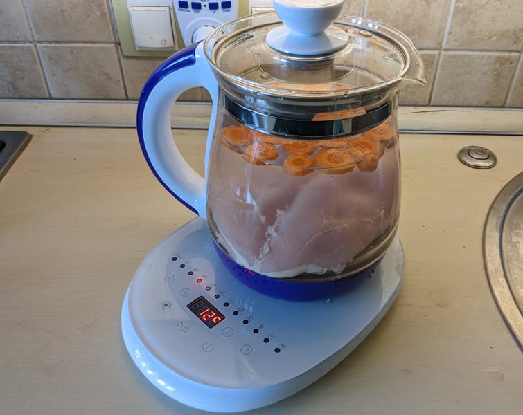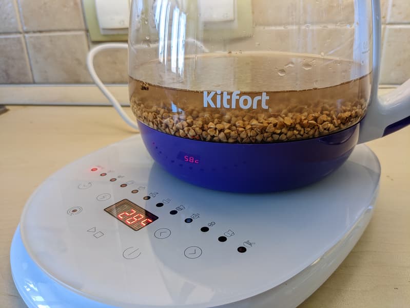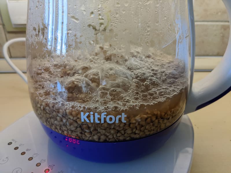 У нас на тестировании Kitfort KT-6130, в котором совершенно легально можно не только кипятить воду и заваривать чай, но и готовить несколько простых блюд. Это очень удобно, если под рукой почему-то нет мультиварки (на даче, при ремонте и так далее).