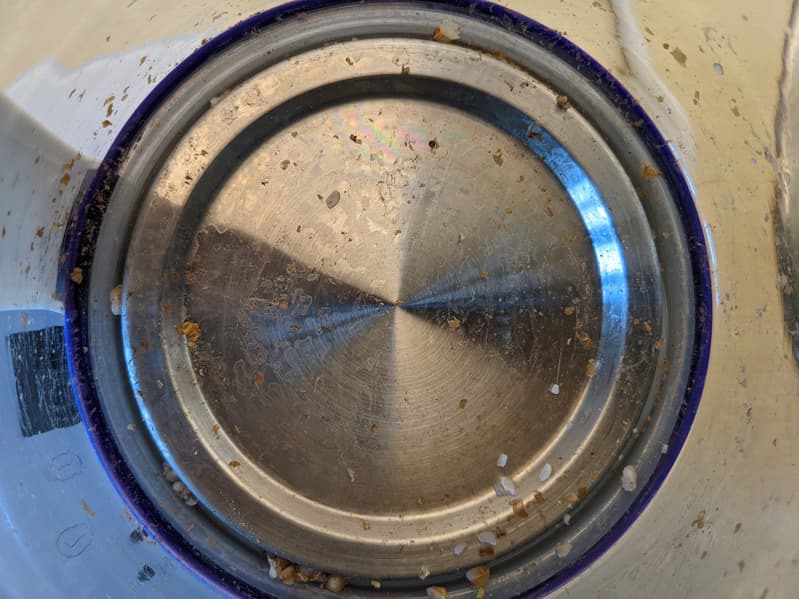 Опустошив емкость, мы присмотрелись к ее состоянию, чтобы оценить трудоемкость мытья. Как и предполагалось при первом знакомстве, частицы крупы остались в щели между стенкой и дном. Удалить их с помощью губки для мытья посуды сложно, но жесткая щетка справляется с этой задачей без труда.