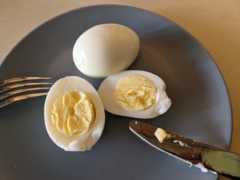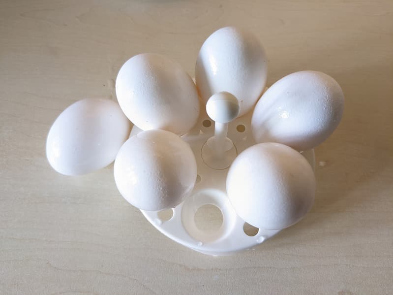 Восьми минут вполне достаточно, чтобы сварить яйца вкрутую. Программа варки сработала на отлично, а вот материал и форма специальной подставки оказались не на высоте: гораздо удобнее обходиться без нее.