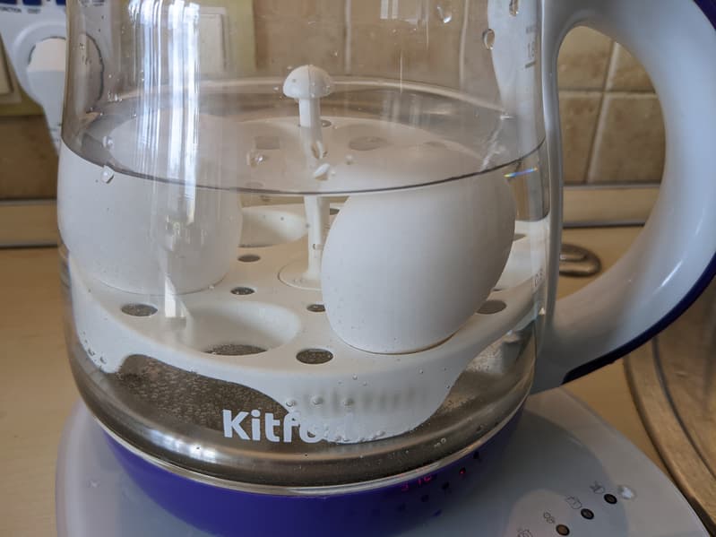 Чайник довел воду до 100 °C и снизил мощность нагрева, поддерживая кипение в течение 8 минут. Когда время вышло, прибор издал звуковой сигнал и выключился. Перевернувшуюся подставку мы извлекли вилкой, а яйца — ложкой.