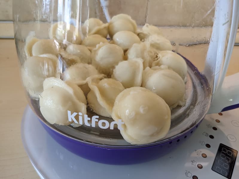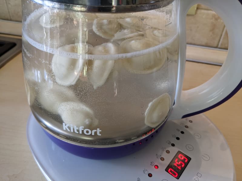 Наполнив чайник подсоленной водой, мы включили его, дождались, пока температура на дисплее достигла 95 °C, и в этот момент засыпали пельмени: логичнее сделать это в конце фазы активного кипячения.