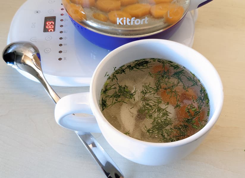 - Суп. Вода кипятится, а затем мощность снижается до все тех же 200 Вт и варка длится 2 часа 15 минут.
