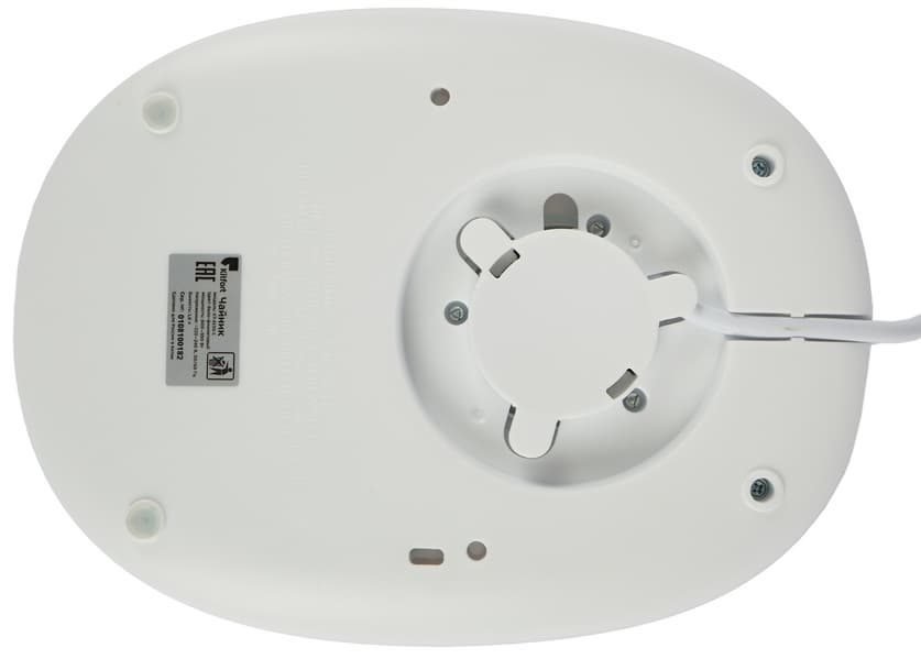 На нижней стороне базы есть отсек для хранения излишков шнура и шильдик с основными техническими характеристиками прибора и данными изготовителя.
