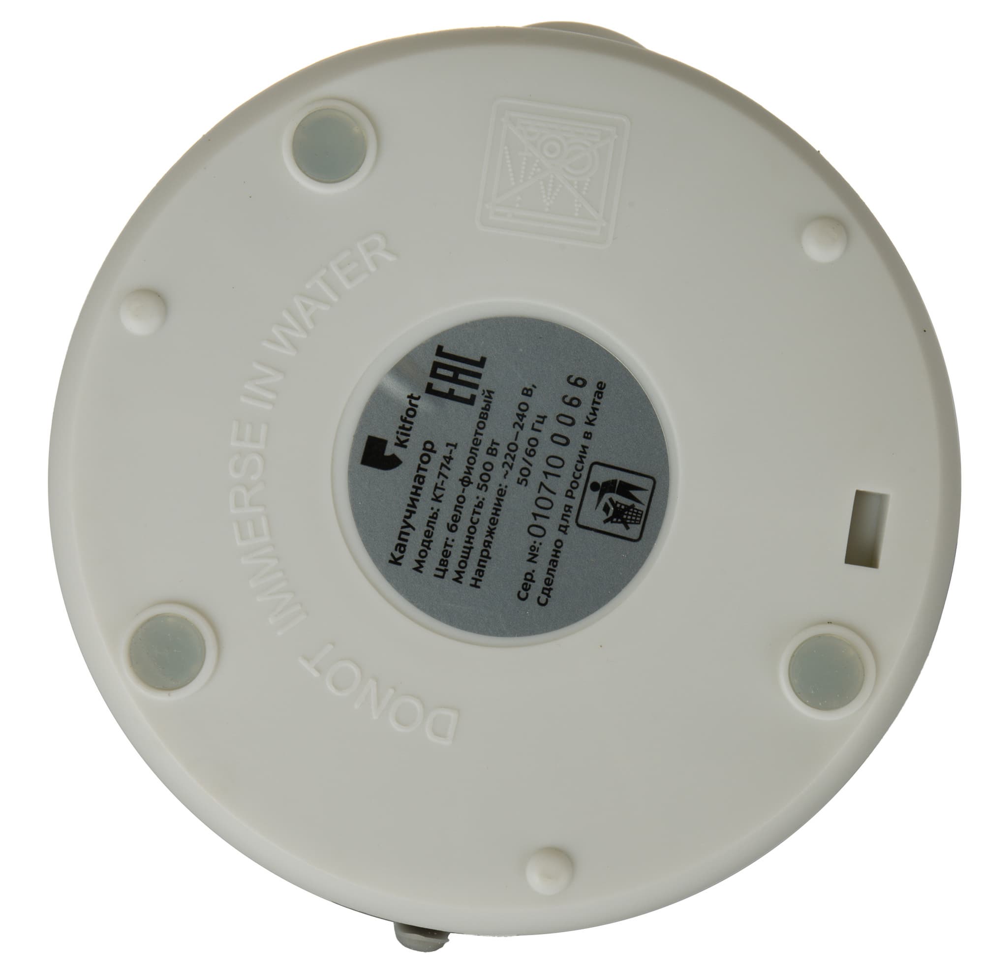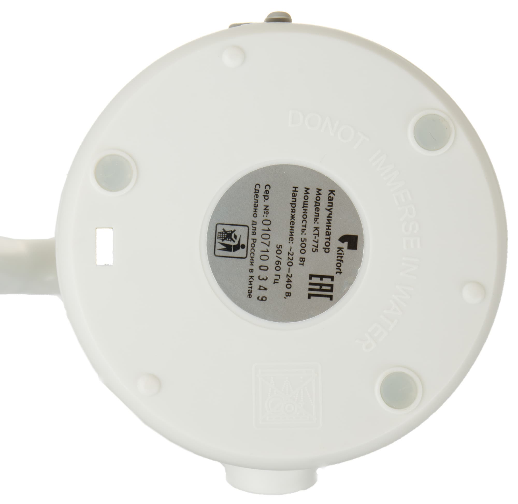 Снизу у прибора мы видим наклейку с технической информацией, резиновые ножки, препятствующие скольжению, и предупреждение о том, что капучинатор нельзя погружать в воду.