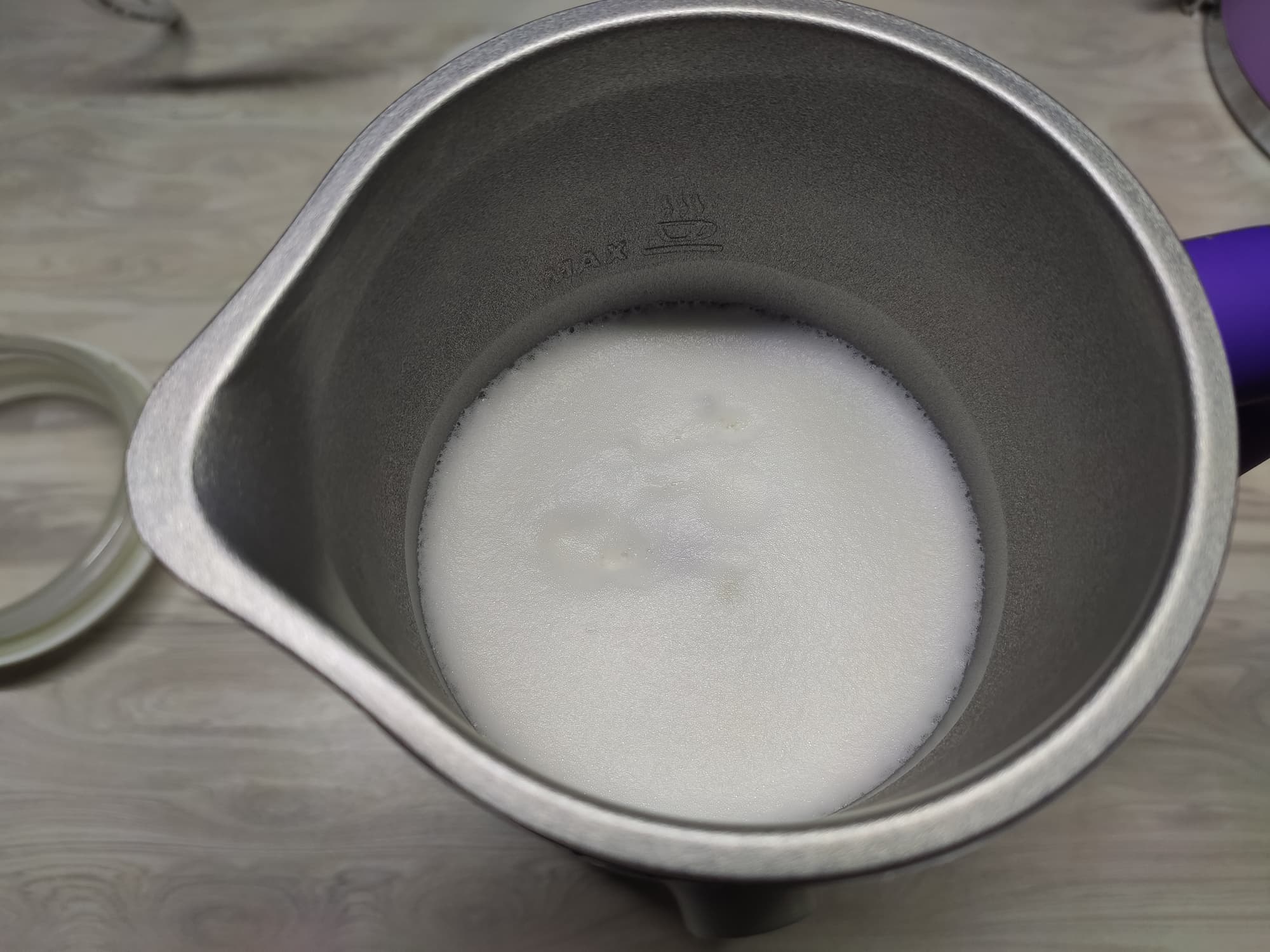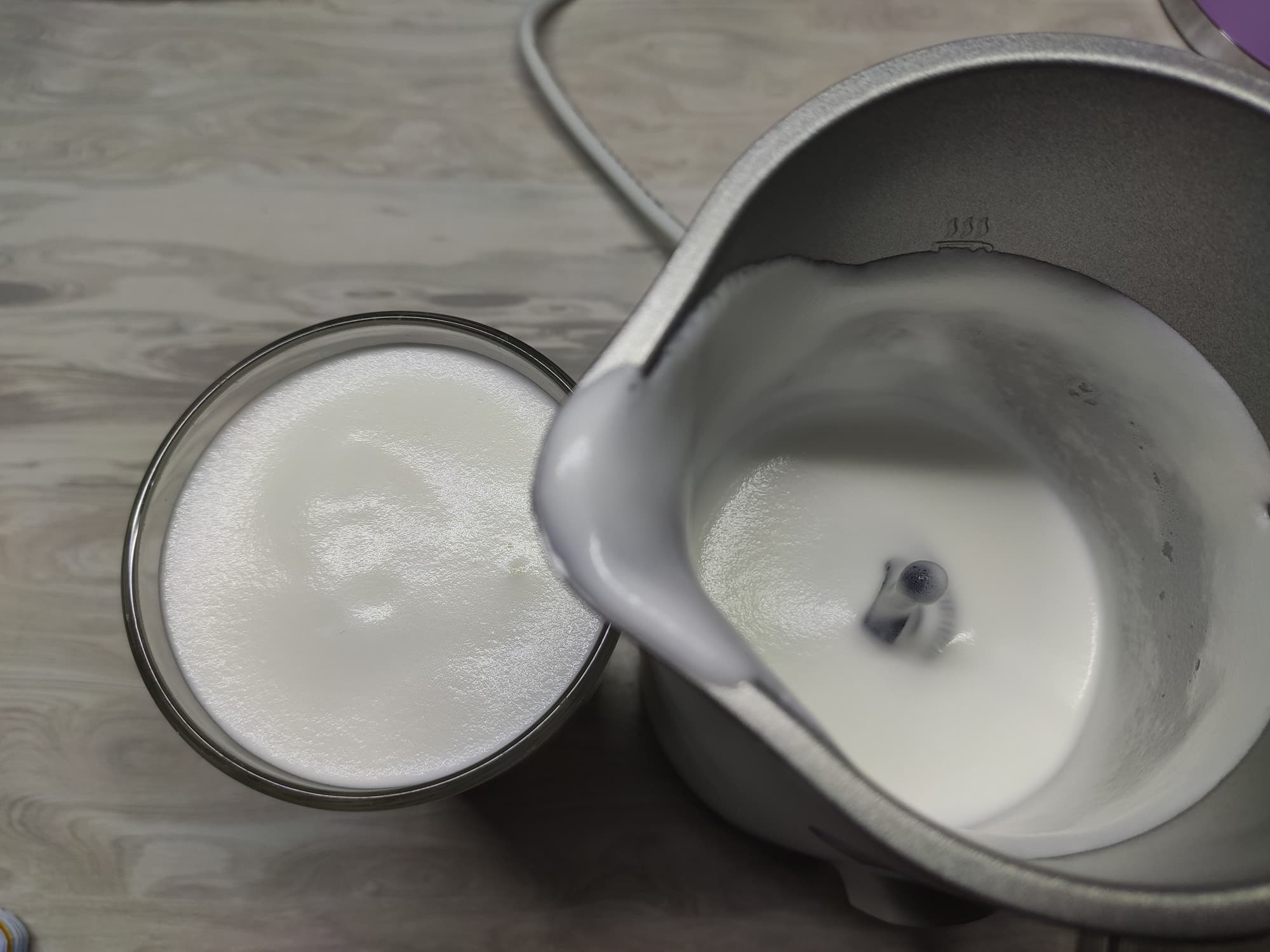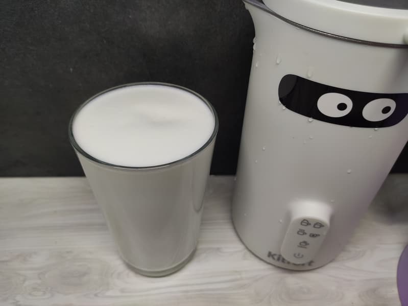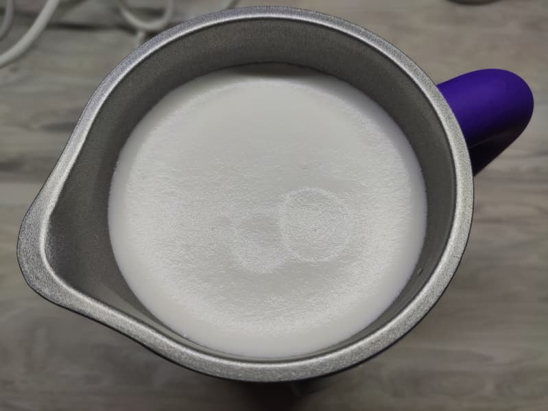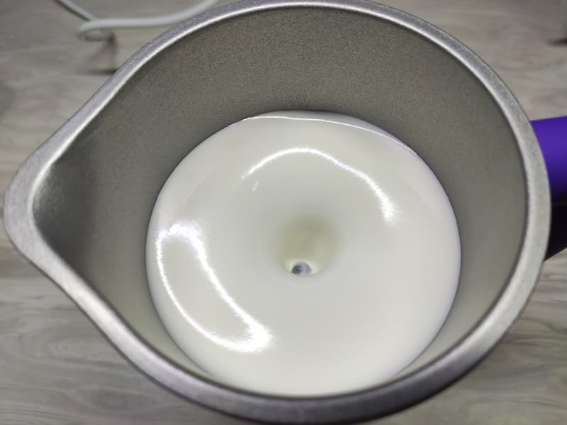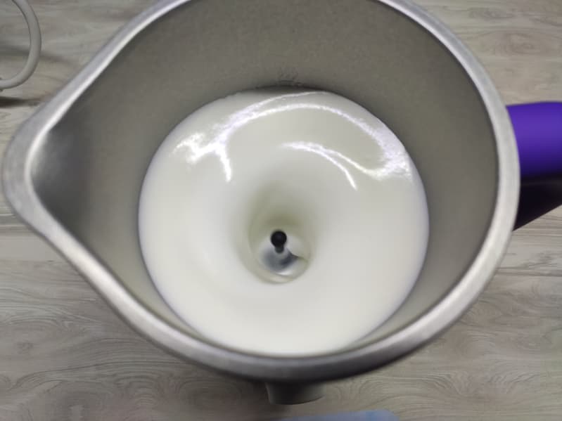 Через 2 минуты и 30 секунд мы получили идеальную густую и равномерно взбитую молочную пену.