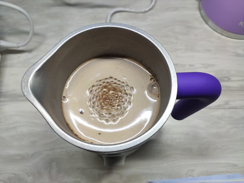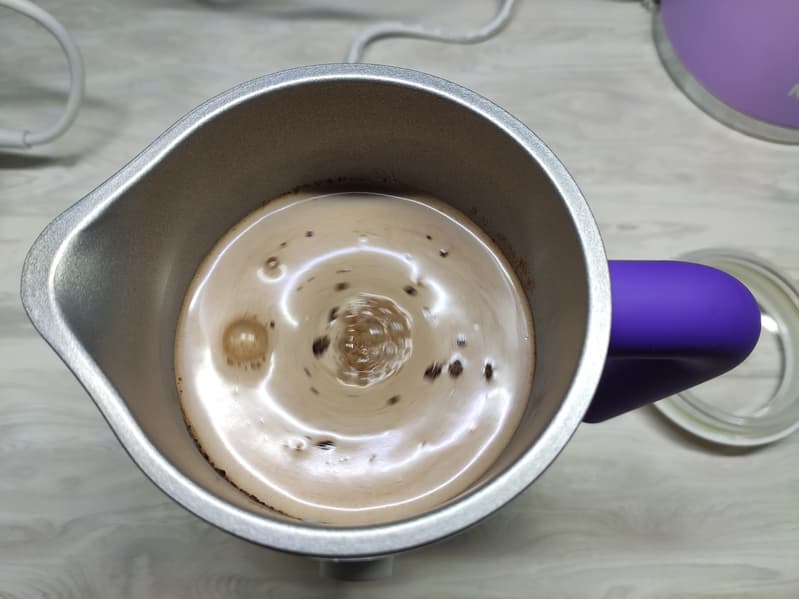 Наконец, через 7 минут и 48 секунд мы получили готовый напиток с температурой 67 °C. Неперемешанных частиц и комочков в нем мы не обнаружили.