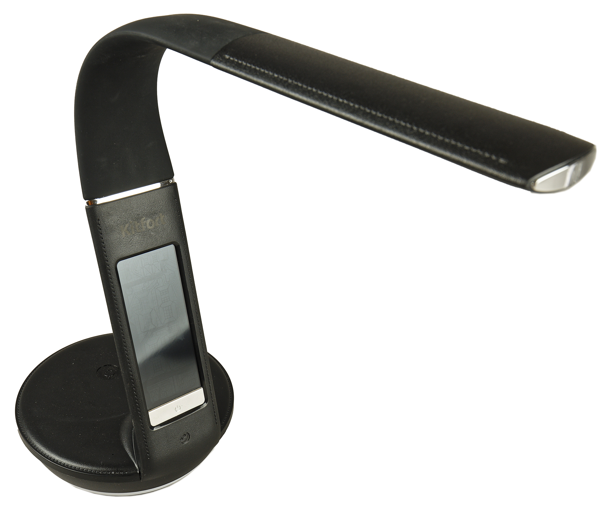 Компактная светодиодная лампа в черном корпусе имеет ряд особенностей. Помимо уже знакомого нам поворотного механизма штанги и рассеивателя, устройство оснащено функцией беспроводной зарядки мобильных устройств Qi, а также часами с датой, будильником и температурой.