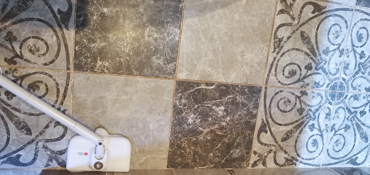 Пол из керамогранитной плитки мы мыли с помощью большой насадки с тряпкой для пола. Уборка самой плитки заняла несколько минут, а вот застарелые загрязнения в швах пришлось протирать щеткой.