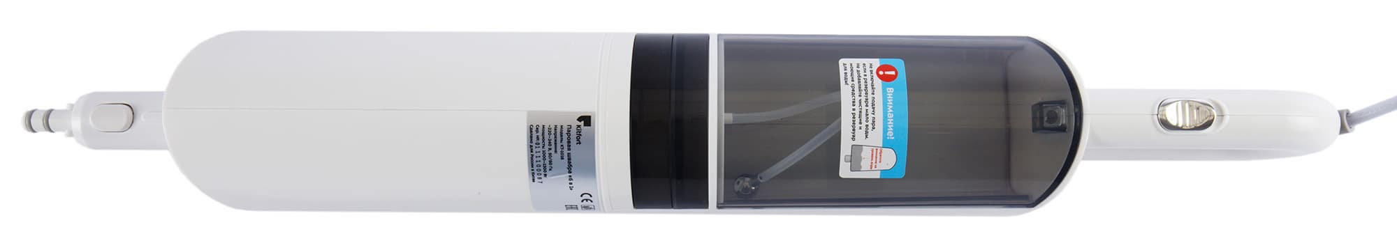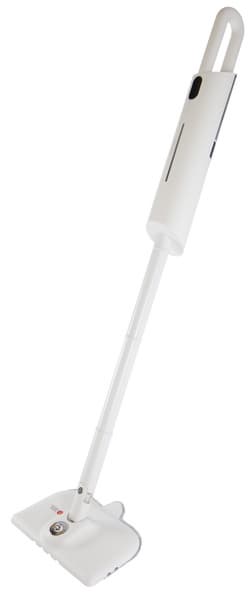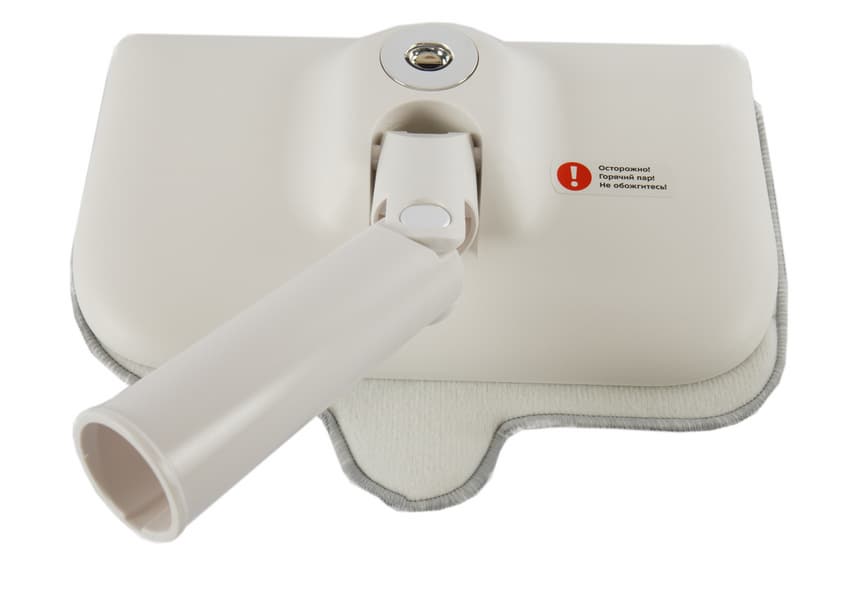 Паровая швабра формой напоминает обычную высокотехнологичную швабру, только с утолщением на ручке. В нем и располагается резервуар с водой, фильтр и бойлер, соединенные удлинительными трубками с насадкой с тряпкой. Устройство белого цвета с небольшим черным дисплеем и дымчато-серым резервуаром для воды. Дизайн прибора достаточно лаконичный, без вычурных деталей.