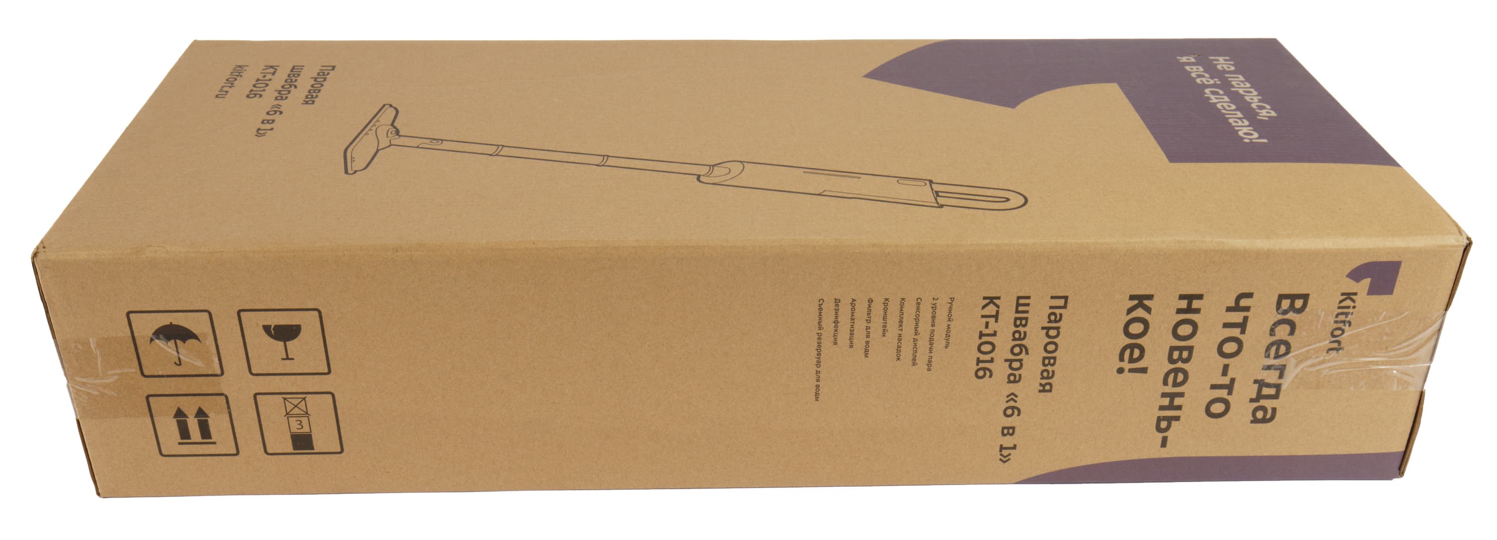 Швабра Kitfort KT-1016 прибыла на тесты в большой коробке из эко-картона. На коробке — логотип компании, схематичное изображение прибора, техническая информация и рекламные слоганы. Полиграфия черного цвета с небольшим добавлением корпоративного синего.