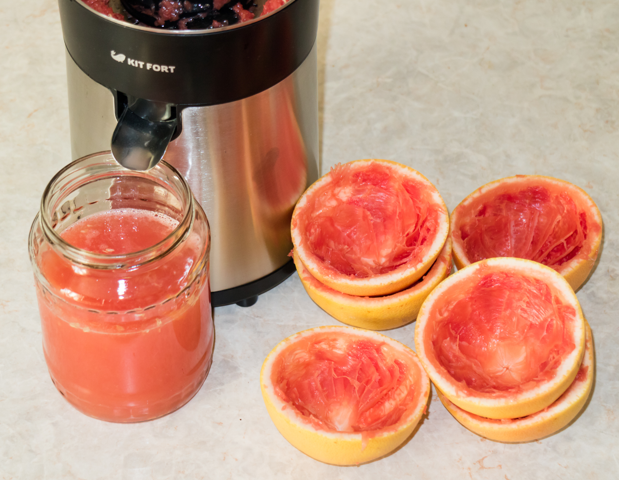 Вес трех грейпфрутов составил 1,056 кг. После отжима получили 486 г сока. Итак, выход составил 46%. Процесс занял чуть больше трех минут. Сок почти прозрачный, в целом без мякоти. Хотя в нем, как и в апельсиновом, иногда встречались волокна и мелкие косточки.