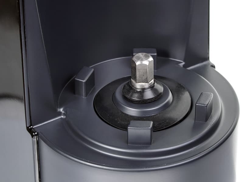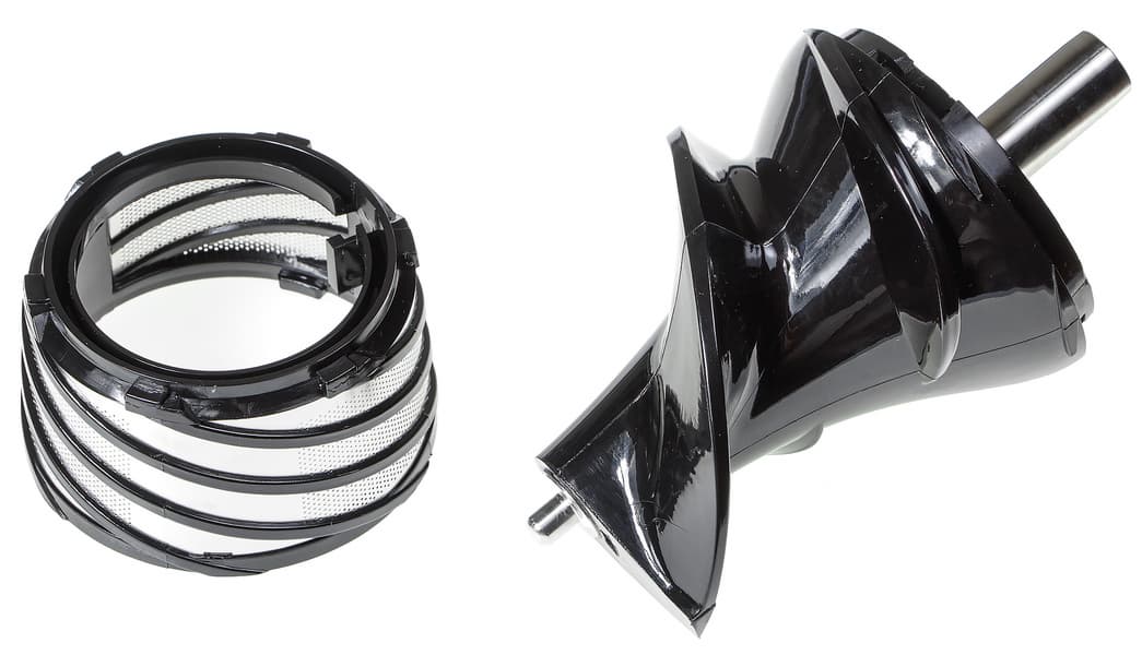 В корпус соковыжималки вставляется массивный шнек и фильтр. Стенка фильтра изготовлена из нержавеющей стали, диаметр отверстий можем оценить как средний — они не микроскопические, но и не крупные. Спиралевидный шнек-пресс тяжелый, отлит из, как указывает производитель, ультрапрочного пластика, который выдерживает большие нагрузки. Шнек насаживается на вал двигателя шестигранным пазом, который усилен металлической вставкой. Ее назначение — равномерно распределять усилие вращения по материалу шнека.