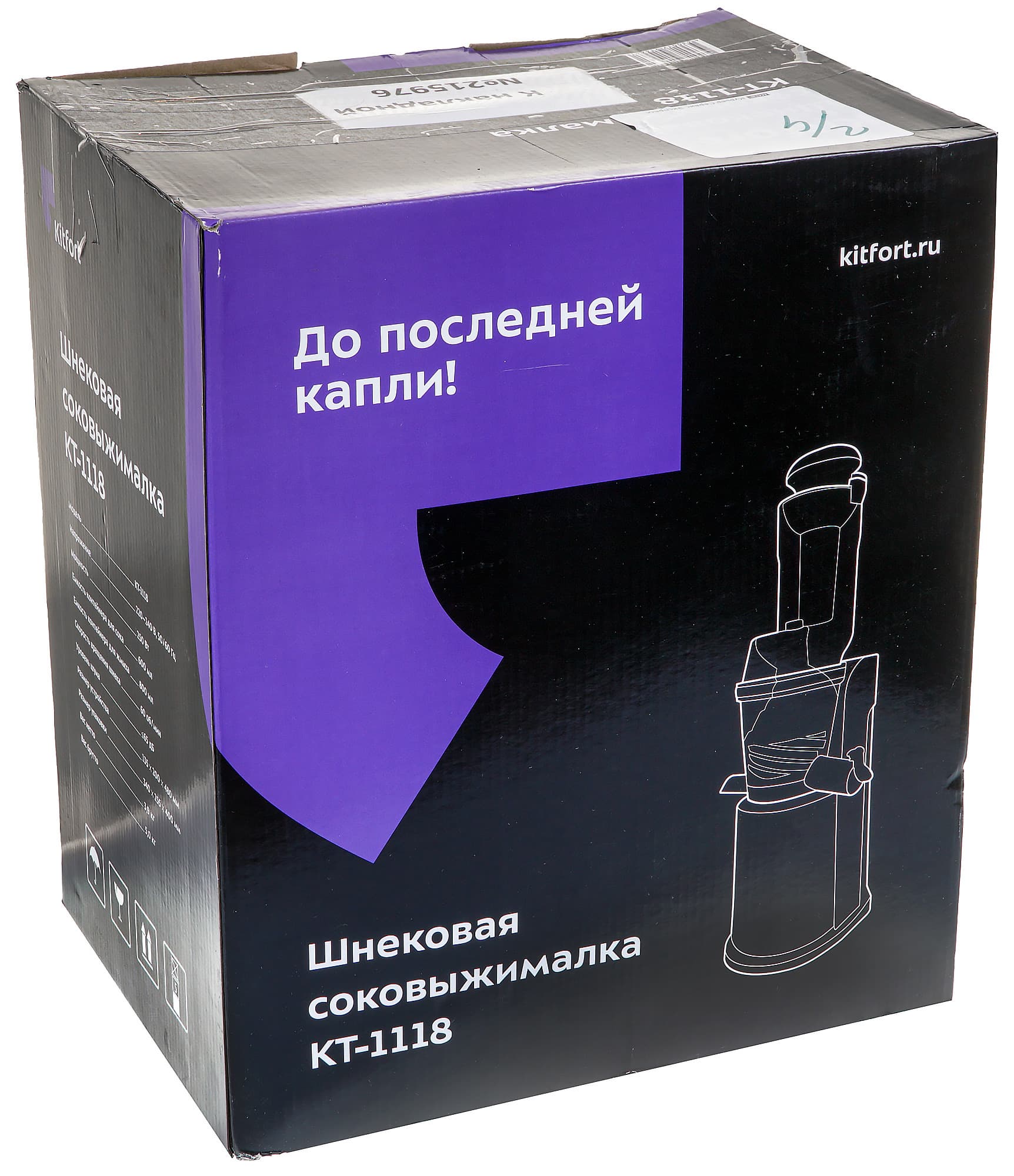 Соковыжималка Kitfort KT-1118 прибыла в тестовую лабораторию в картонной коробке черного цвета с яркими пятнами цветовых акцентов. Оформление и содержание информации, размещенной на упаковке, соответствует общему фирменному стилю Kitfort: схематическое изображение устройства, его название, модель и слоган. На боковых сторонах представлены сведения о технических характеристиках и достоинствах соковыжималки. Никакими приспособлениями для переноски упаковка не снабжена.