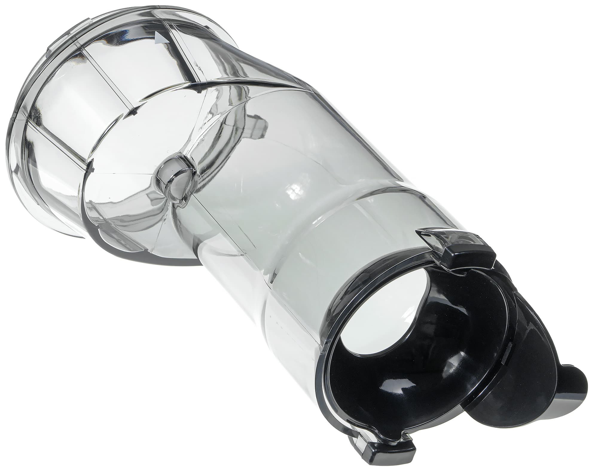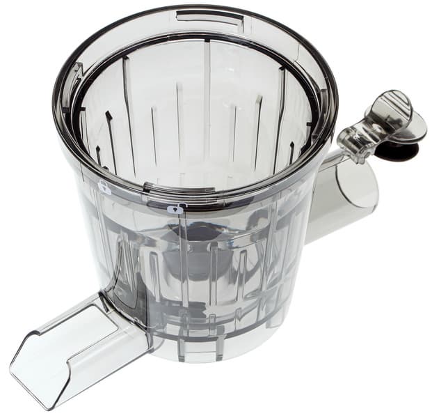 Отжимная чаша сделана из толстого (около 4 мм в верхней части) прочного пластика. Отверстие по центру дна, куда входит вал двигателя, уплотнено резиновой прокладкой. Носик для выхода сока снабжен системой «капля-стоп», попросту — откидной плотно вставляемой крышечкой. Отверстие для выхода жмыха плотно закрывается силиконовой заглушкой.