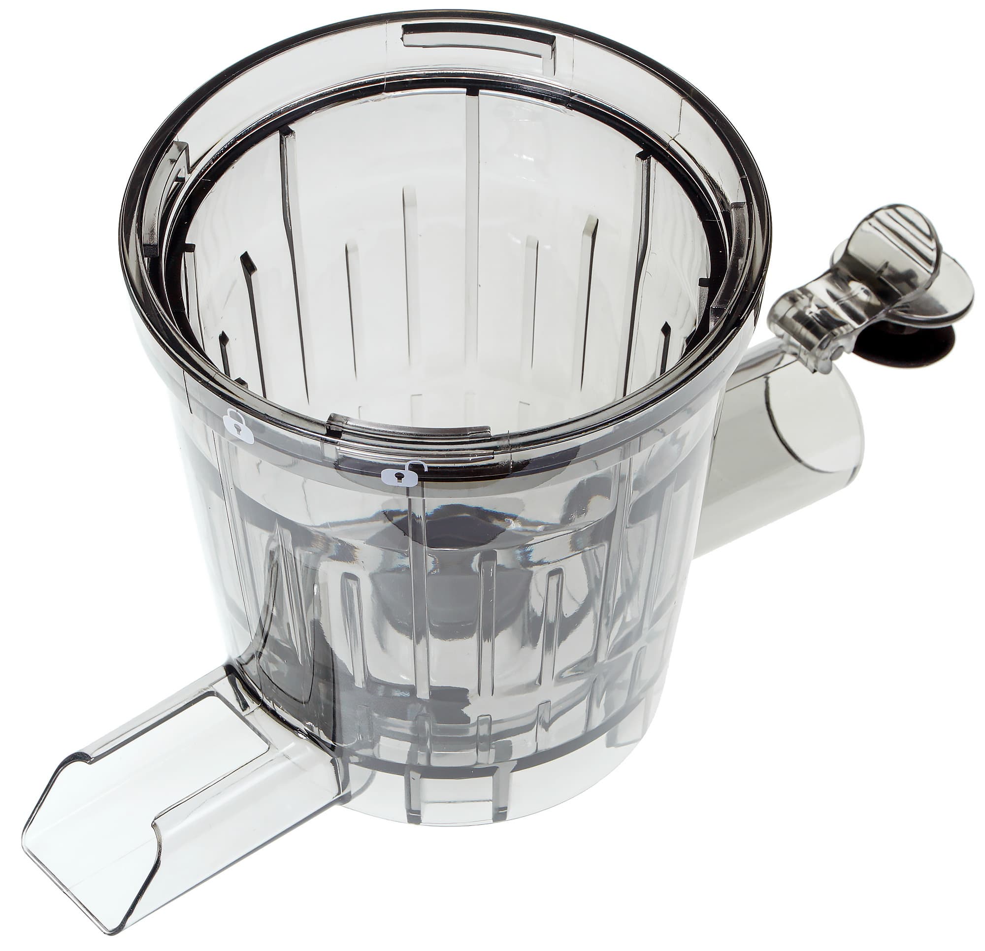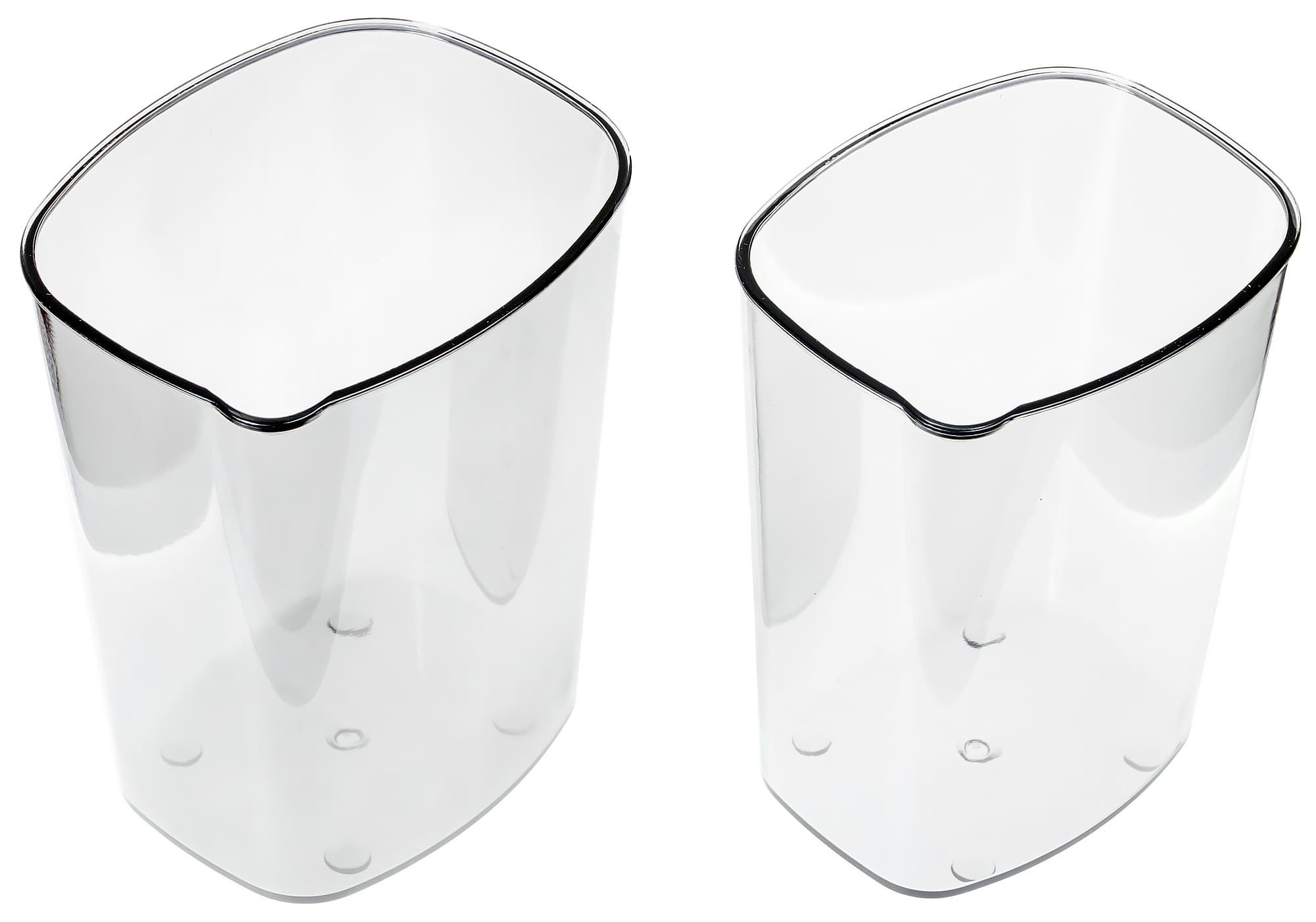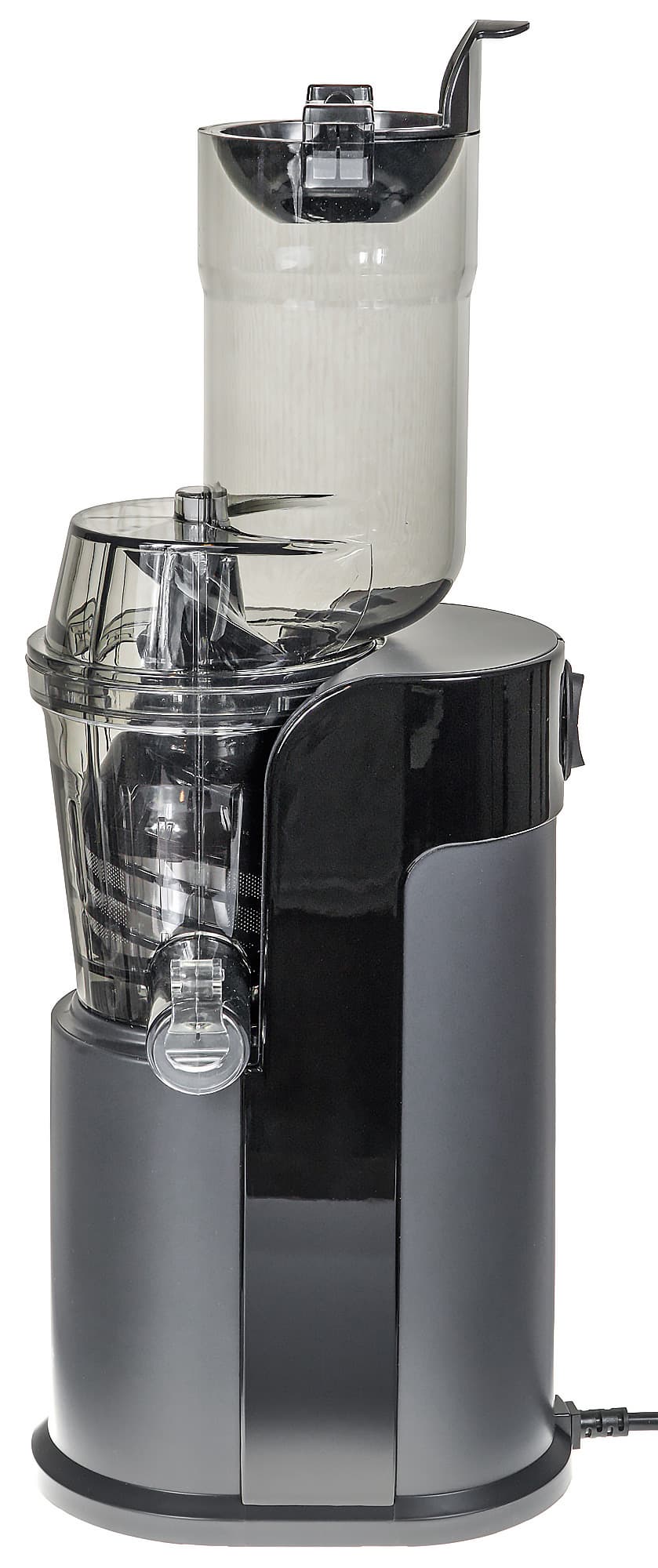 Обе тары — для сока и жмыха — имеют носик, который облегчает слив или сбрасывание содержимого. Одна сторона емкости узкая, поэтому стакан удобно держать в руке. Заметим, что форма емкостей идентична, что позволяет вставлять меньший стакан в больший — несомненно, это огромный плюс к компактности и удобству хранения прибора. На стенках нет указателей объема — но, по большому счету, кому они нужны? Пользователь, скрупулезно интересующийся весом и объемом потребляемых продуктов или эффективностью отжима, как правило, имеет в своем арсенале весы.