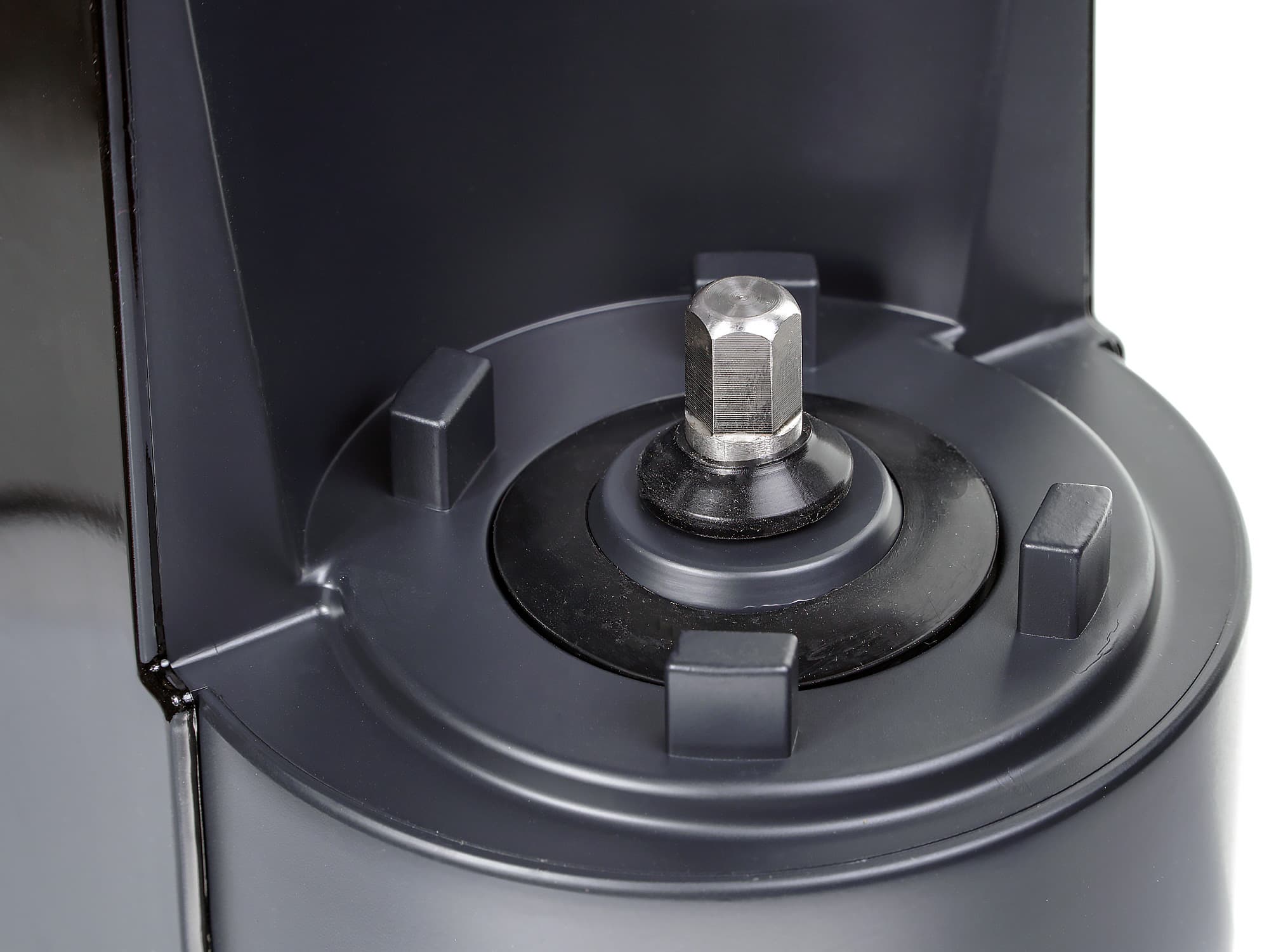 Корпус весьма тяжел и очень устойчив. В центре площадки для установки соковыжималки находится мощный металлический шпиндель и четыре выступа высотой в 1 см для размещения отжимной чаши. Вал защищен резиновой накладкой, в основании имеется резиновый уплотнитель, призванный, помимо прочего, предотвращать вибрации при работе.
