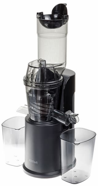 Шнековая соковыжималка Kitfort KT-1118 оказалась приятным в эксплуатации прибором. Аппарат аккуратно изготовлен и собран, укомплектован стаканами для жмыха и сока, а также щеткой для очистки труднодоступных мест. Впрочем, с уходом не возникло никаких затруднений. К несомненным достоинствам отнесем небольшой размер и широкое загрузочное отверстие. Со всеми тестами прибор справился хорошо, по результатам стандартного тестирования по методике iXBT.com он вошел в группу средних по эффективности отжима и времени работы.