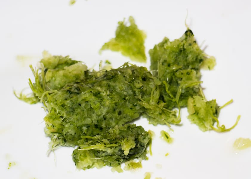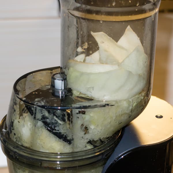 Так что рассыпавшиеся листья уходили внутрь отжимной корзины в двух случаях или их комбинации: при загрузке новой порции или включении обратного хода. В целом за цикл отжима сока из килограмма белокочанной капусты мы четыре раза запускали реверс.