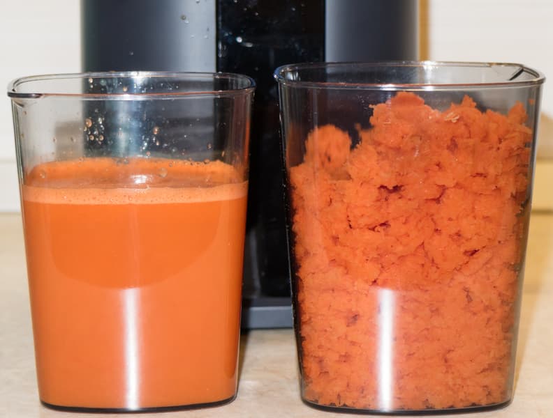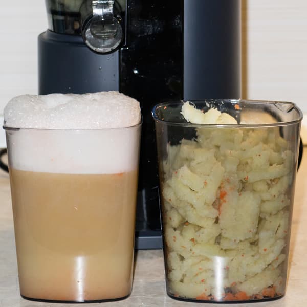 Сок с небольшим количеством мякоти, пены немного, жмых достаточно сухой.