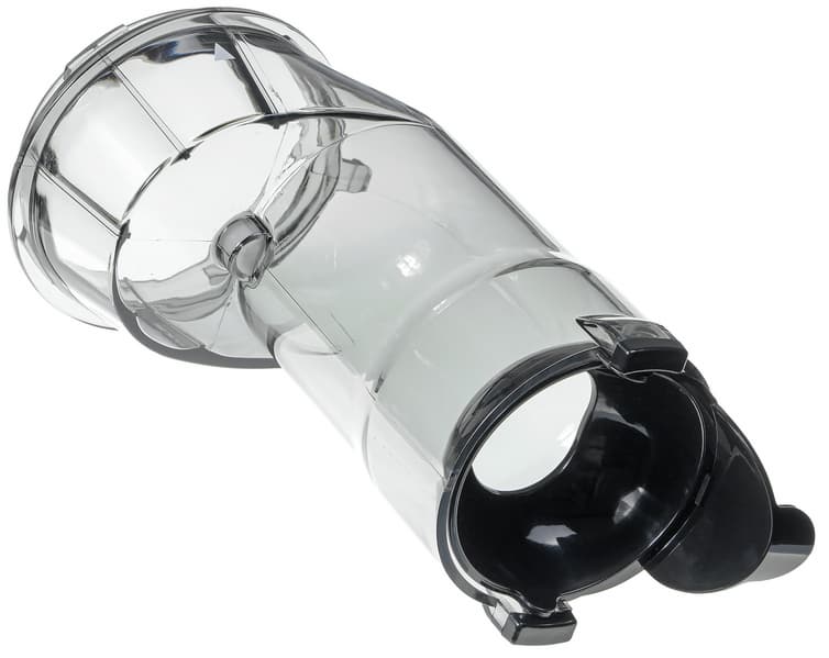 Крышка, надеваемая сверху и фиксирующая всю конструкцию, сделана из прозрачного затемненного пластика. Большой интерес представляет загрузочное отверстие. Диаметр самого отверстия около 8,5 см. На нем закреплен несъемный ограничитель. Отверстие в ограничителе уже меньшего диаметра: 4,5×3,5 см. Ограничитель может быть перевернут на 180°, что позволит скинуть уложенный в него продукт внутрь отжимной корзины.