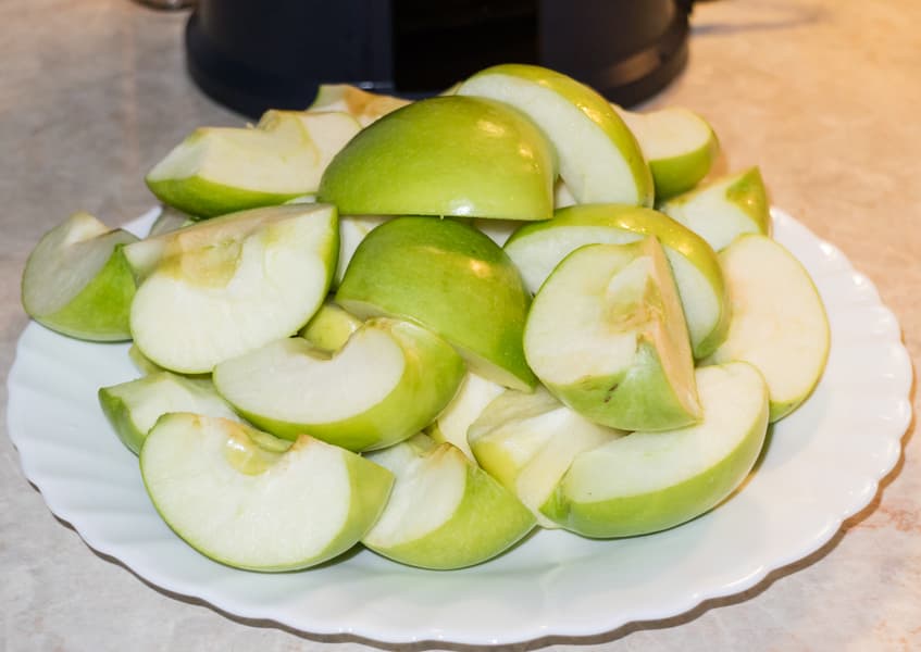 Мы не любим сок с горчинкой, поэтому удалили из яблок сердцевину с косточками. Изначально нарезали яблоки на четыре части, но при подаче разрезали каждый ломтик еще напополам.
