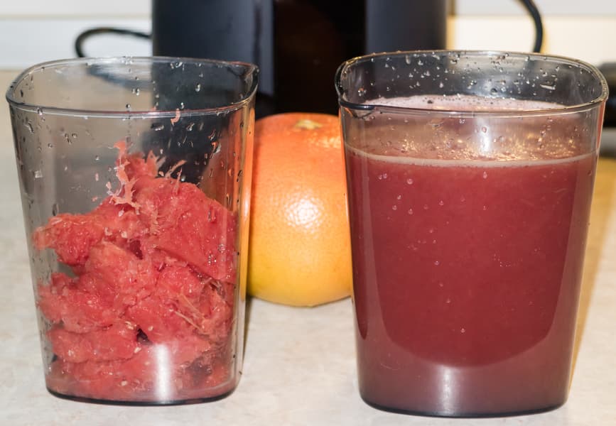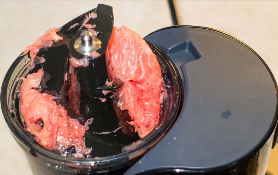 При переработке больших сочных кусков грейпфрута выявилась одна особенность — крупные куски могут не уходить вглубь отжимной корзины, «повиснув» на ребре шнека. Запуск обратного хода не всегда решает эту проблему, поэтому последние кусочки овощей и фруктов, особенно мягких фруктов, лучше нарезать помельче. Толкатель совсем не помощник в этом деле, поскольку его длина не позволяет стряхнуть или подтолкнуть продукт непосредственно под ребро шнека.