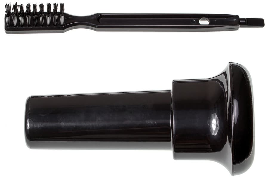 Толкатель пластиковый, оснащен удобным держателем. Щетка с щетиной средней жесткости и заостренным кончиком поможет очистить отверстия фильтра и добраться до самых дальних мест корпуса соковыжималки.