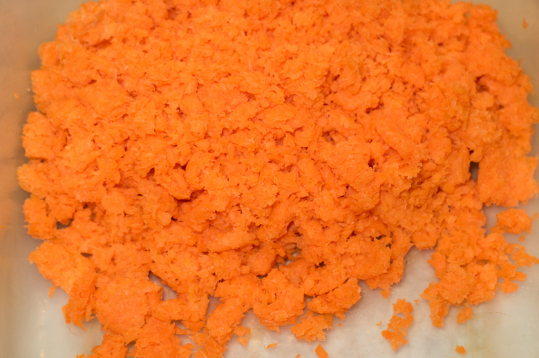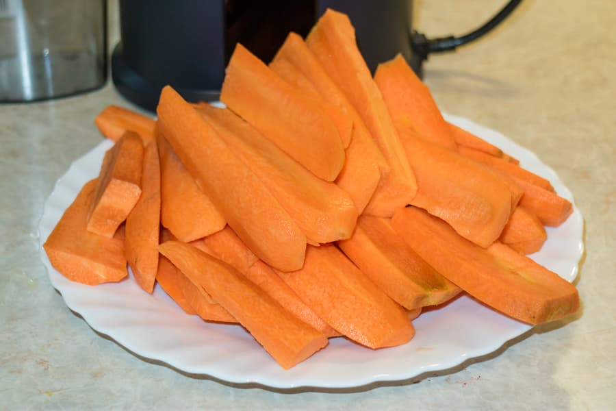 Ровно килограмм очищенной моркови был нарезан на продолговатые брусочки: мы разрезали корнеплод вдоль на 4-6 ломтиков. Если морковка была длинной, разрезали ее пополам, в общем, делали так, как нам было привычно, не особо заботясь об удобстве прибора.