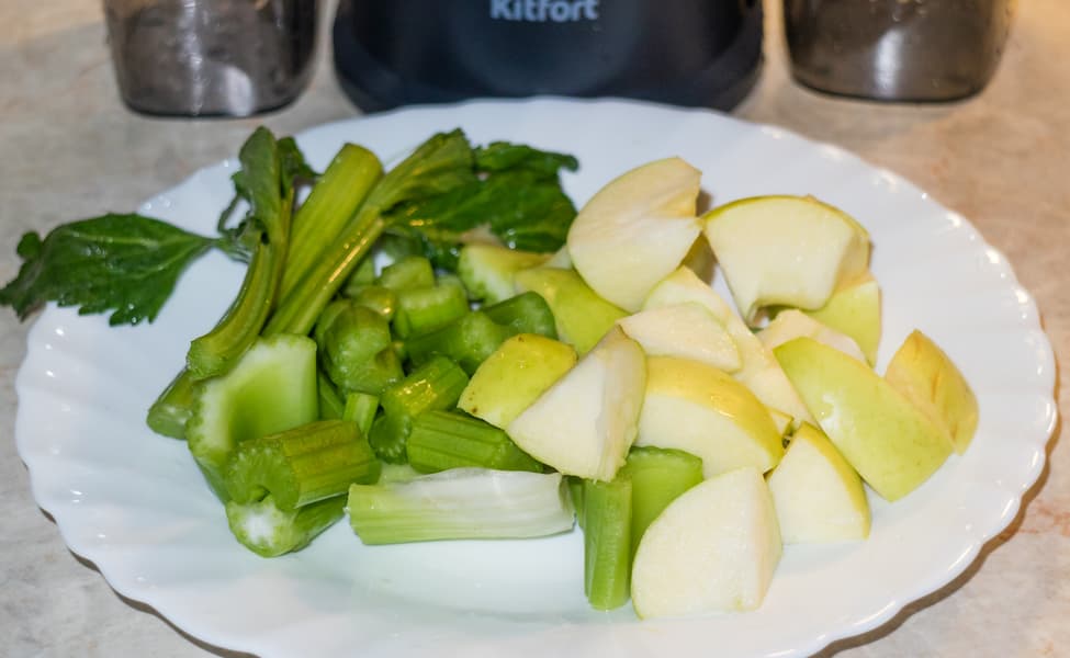 Напоследок проверим, как соковыжималка справляется с отжимом сока из волокнистых структур. Два стебля сельдерея нарезали на небольшие, как рекомендует инструкция, кусочки. Добавили к ним одно очищенное и нарезанное яблоко (пить сок из одного сельдерея сложновато).
