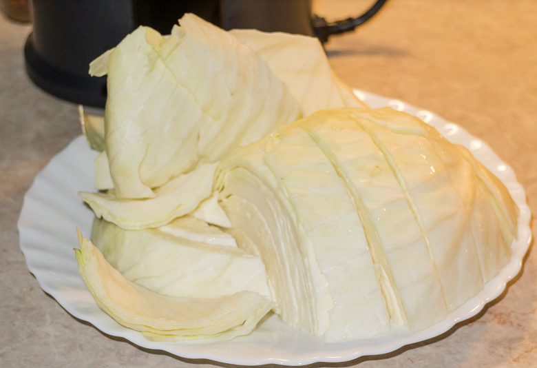 Капусту нарезали на длинные крупные куски, поскольку она все равно расслоится и будет загружаться или по одному скрученному листу, или несколькими сжатыми.