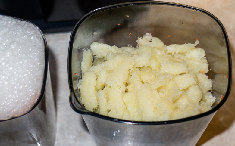 После теста с капустой данный эксперимент шел как по маслу: кусочки равномерно и спокойно уходили под шнек, толкатель лежал невостребованный и позабытый в сторонке, сок лился в один стакан, жмых медленно выползал в другой.