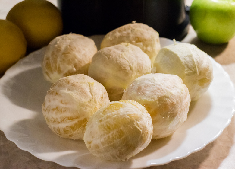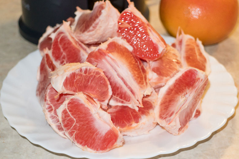 Подготовили грейпфруты привычным образом: очистили их от кожуры и разломали на дольки. Вес готового к переработке сырья составил 1 кг.