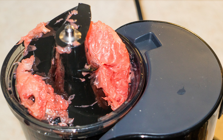 Работали неспешно, дожидались, пока один кусок попадет на ребро шнека и, в идеале, скроется внутри. Но частенько закидывали по несколько долек, чтобы таким образом надавить на них и протолкнуть внутрь отжимной корзины. Несмотря на все наши ухищрения, к окончанию теста в области верхней части шнека застряли два куска грейпфрута. Уйти вниз им не помогли ни проталкивание, ни реверс.