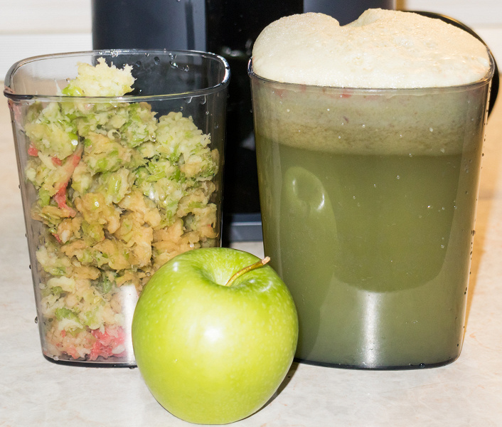 Отжим сока шел весьма бодро и равномерно, жмых ровным потоком сваливался в контейнер. Никаких замечаний к работе соковыжималки предъявить не можем при всем желании.