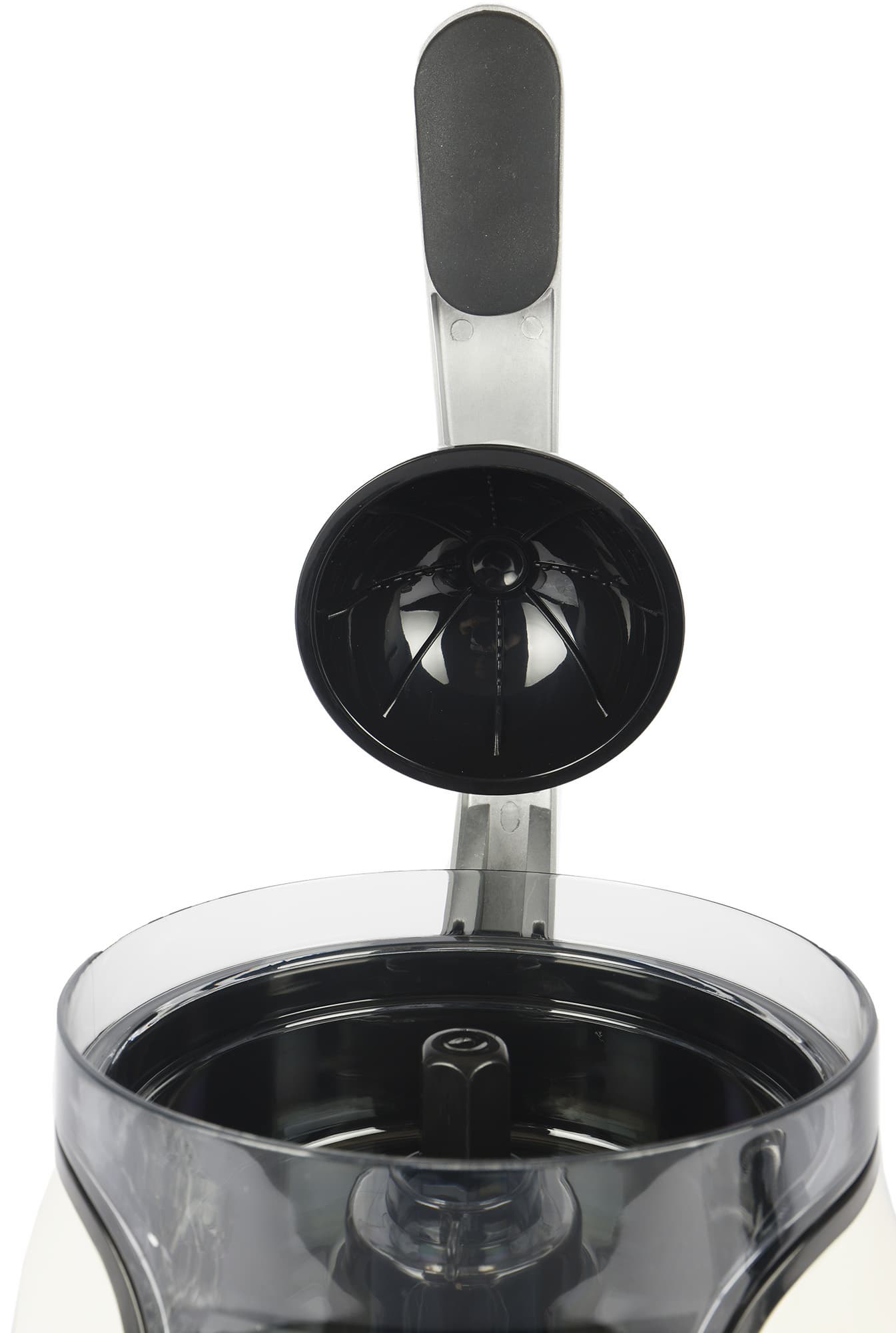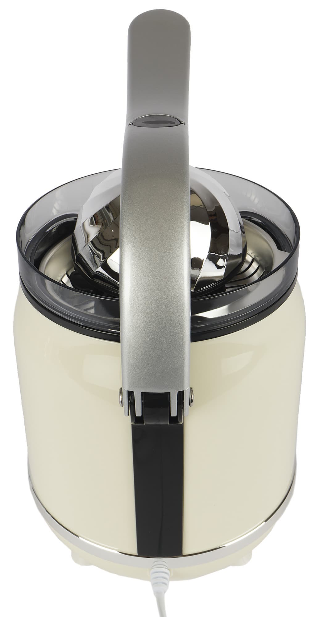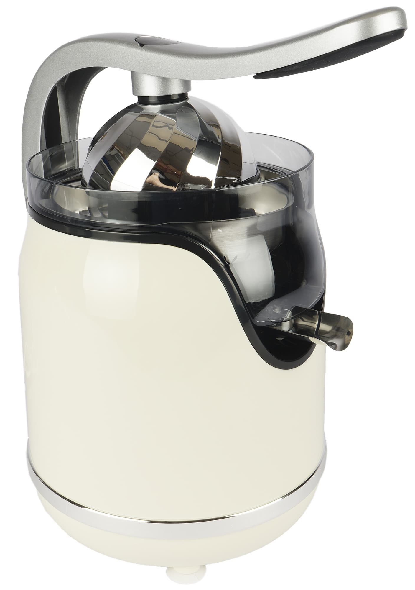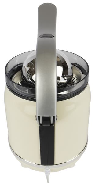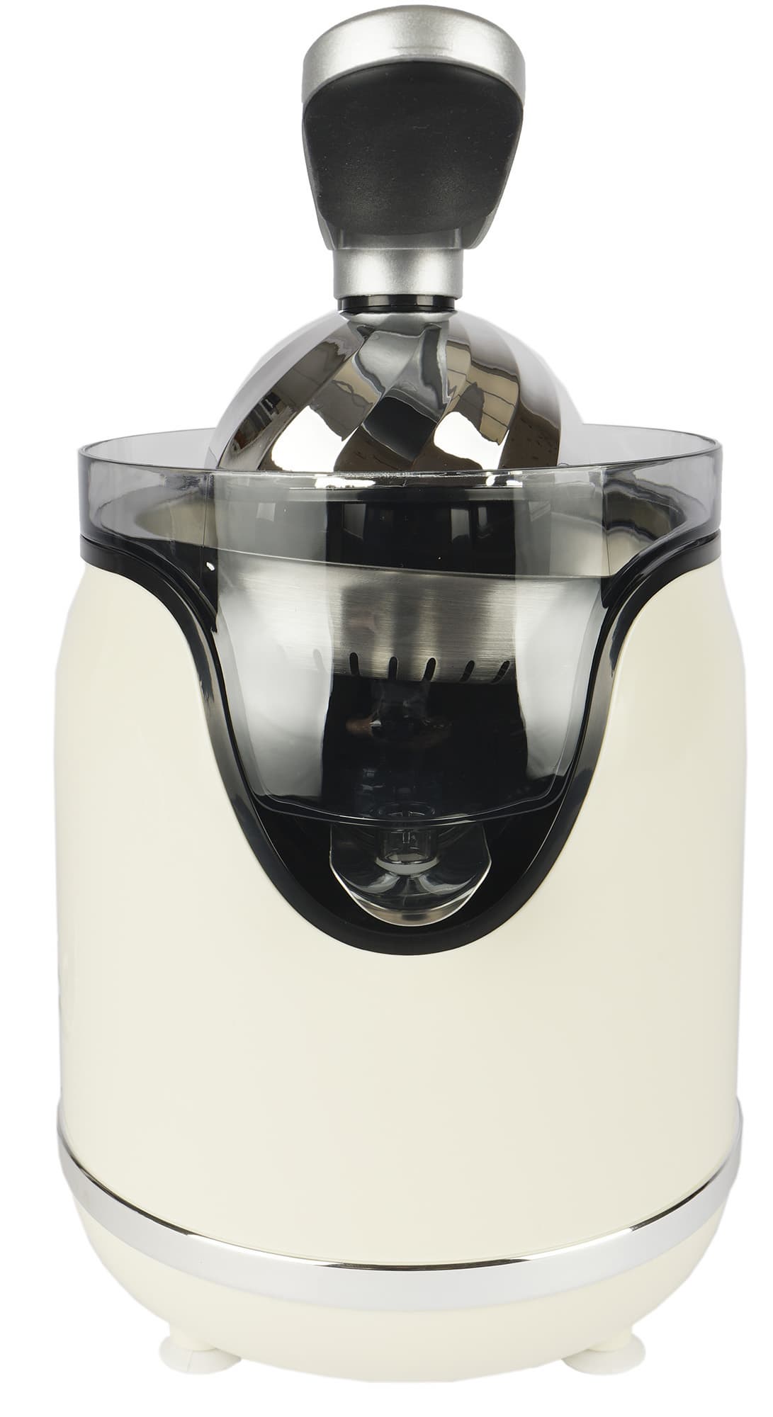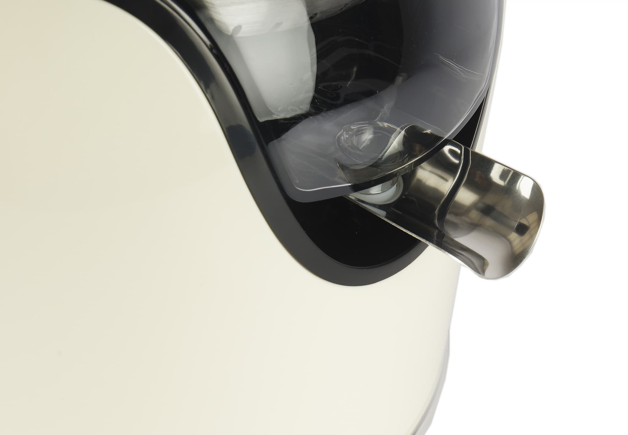 Наш прибор выполнен в ретро (винтажном) стиле. Для покупки доступны варианты в двух цветах: бежевом и черном. По заявлению разработчика, соковыжималка обязательно украсит вашу кухню и обеспечит дополнительное удовольствие в использовании. Мы склонны с этим согласиться. Глянцевый пластик, из которого сделан корпус устройства, выглядит весьма впечатляющие. А элементы из металла (либо окрашенные под металл) лишь усиливают это впечатление.