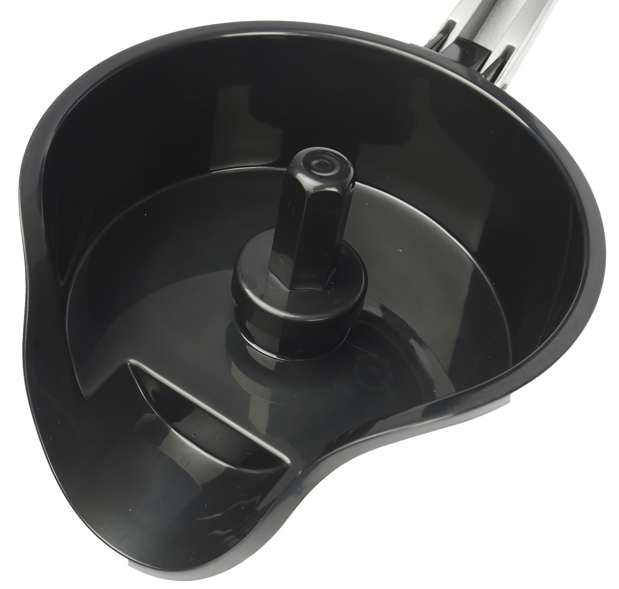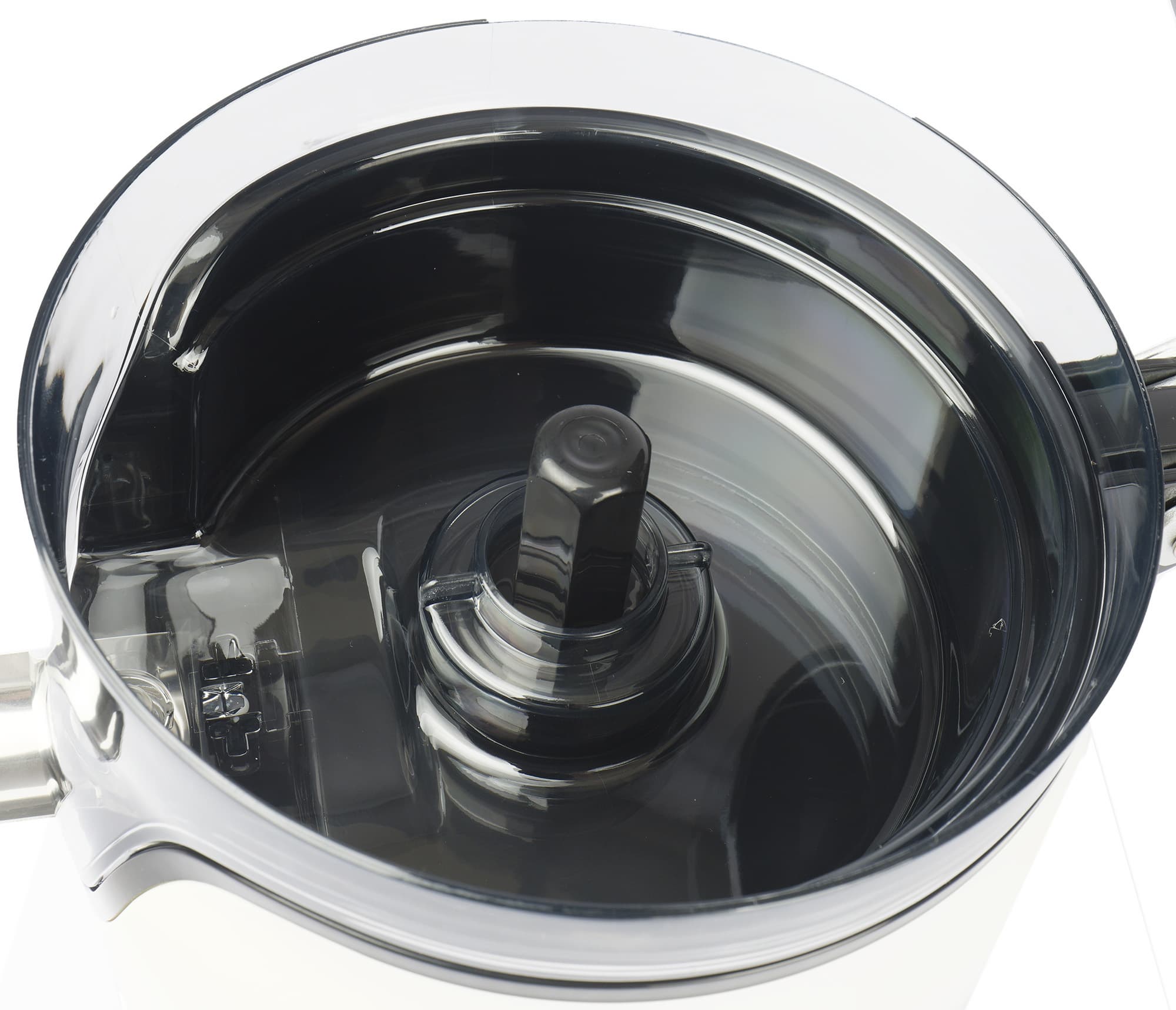 Лоток для сока, сделанный из затемненного прозрачного пластика, имеет небольшой металлический носик, выполняющий роль пробки. В верхнем положении носик блокирует подачу сока, что позволяет сменить емкость для сока, не опасаясь, что капли попадут на рабочую поверхность.