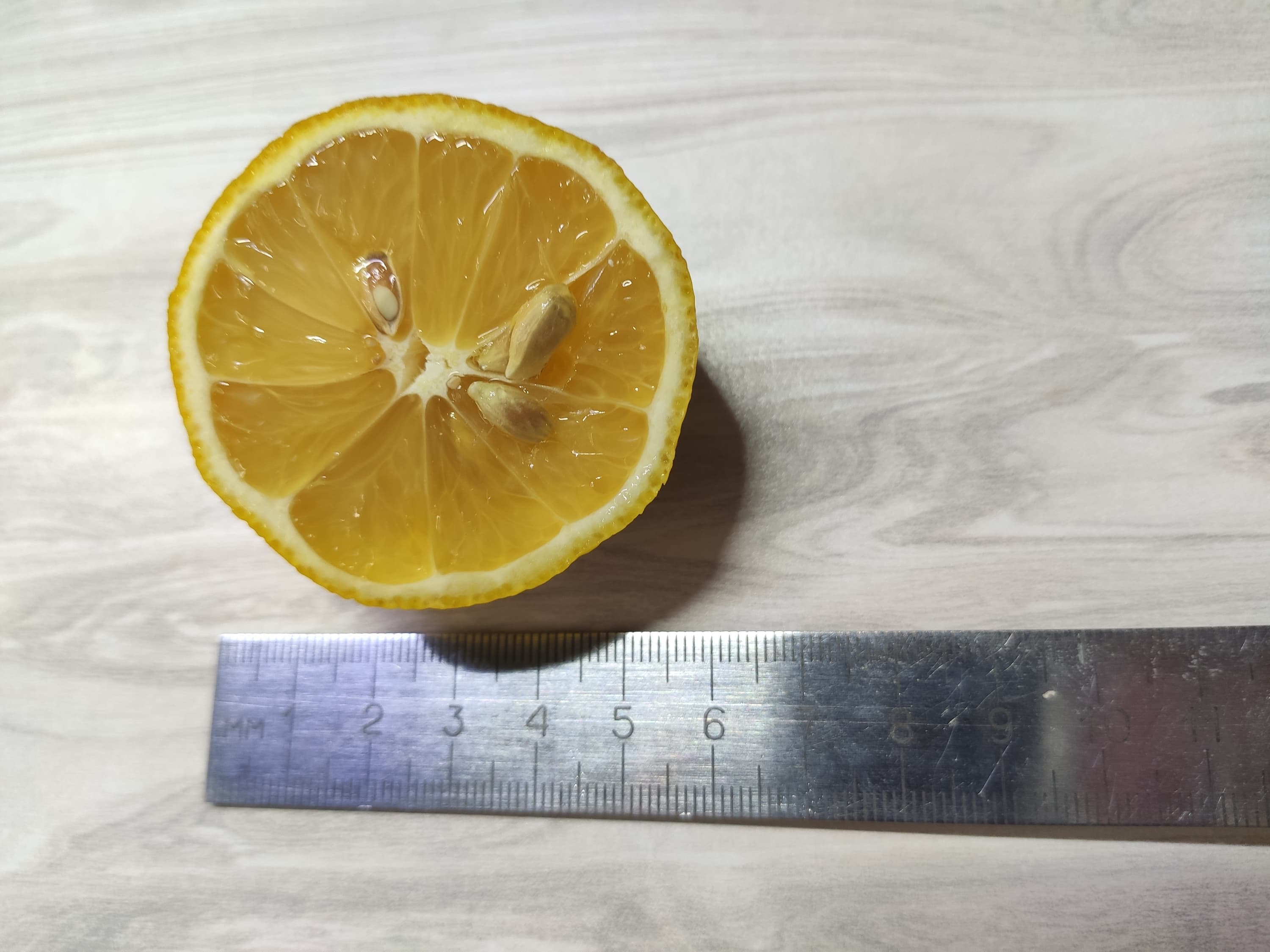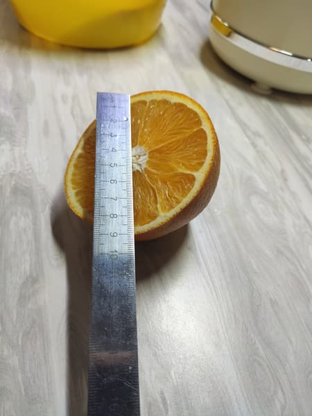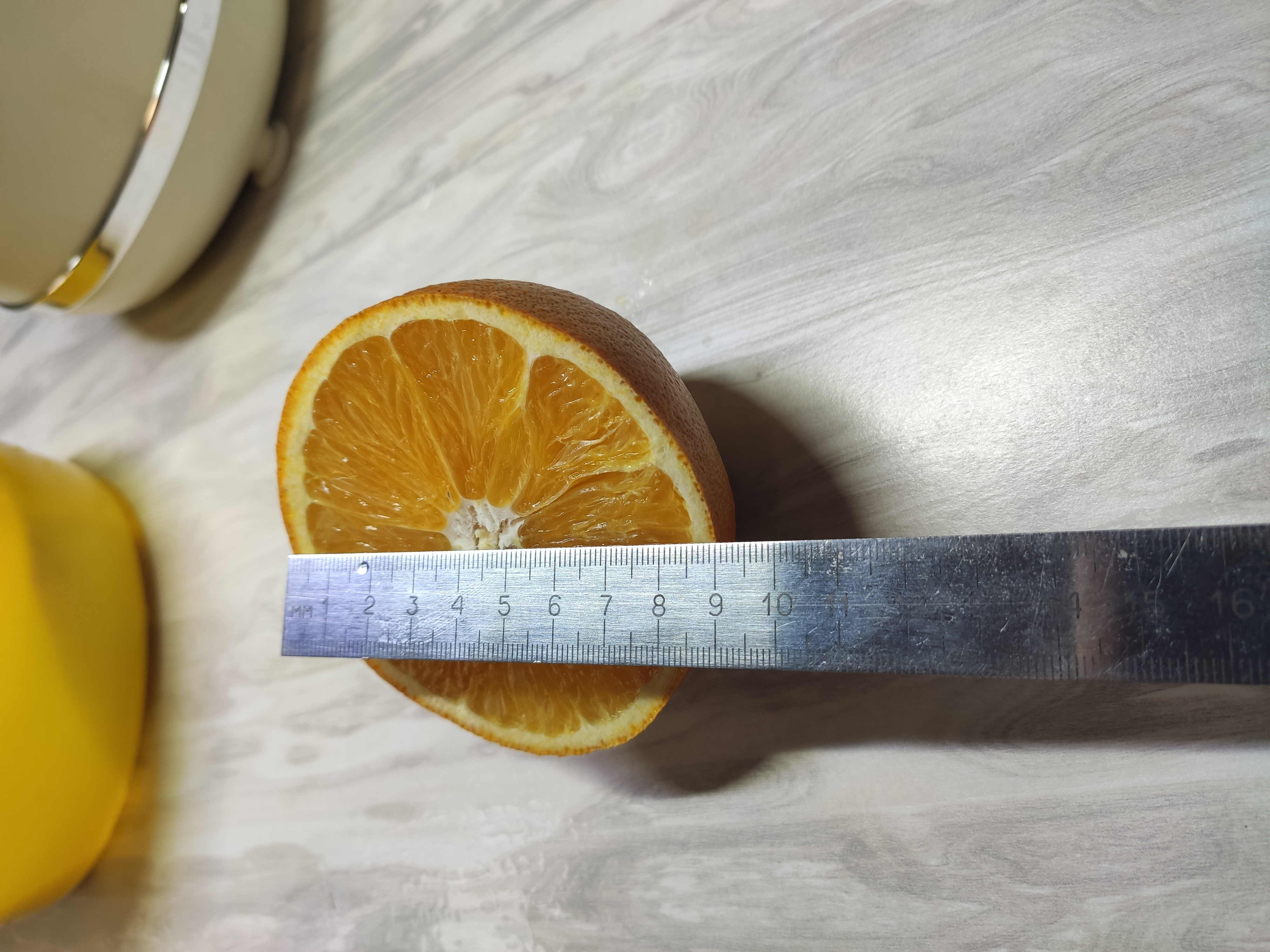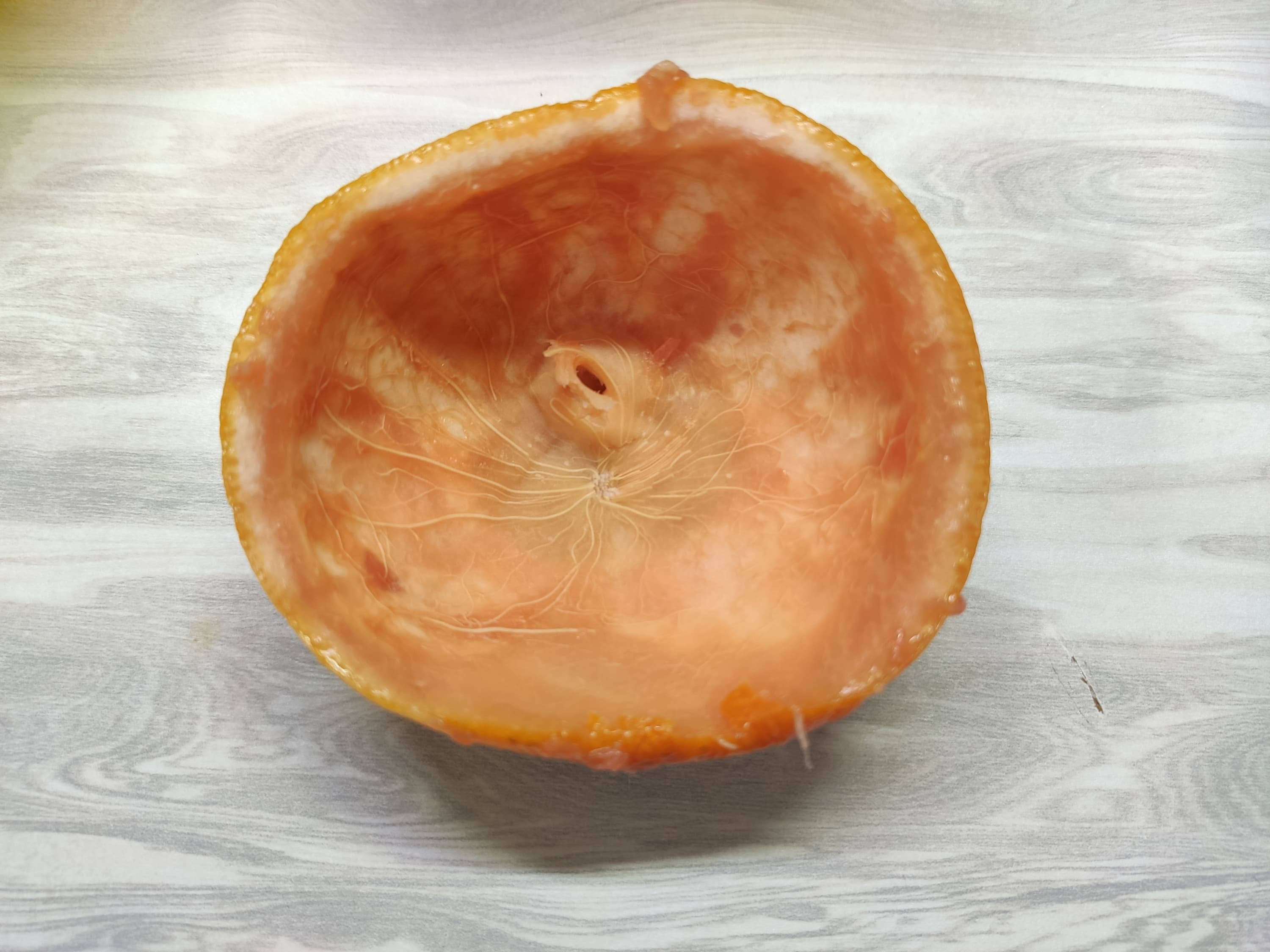 Вес неочищенных апельсинов составил ровно килограмм. Мы вымыли и разрезали все апельсины на две половинки.